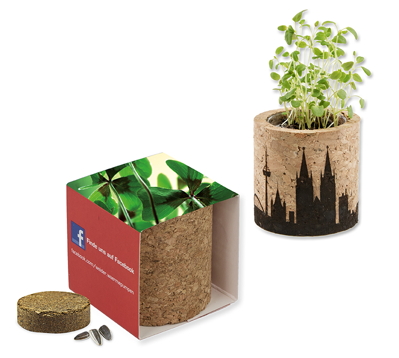 Kork ist das Trendmaterial und zeigt Ihre Naturverbundenheit. Das dekorative Pflanz-Kork rund besteht aus nachwachsendem Rohstoff und macht eine sensible Auswahl des werbenden Unternehmens sichtbar. Geliefert wird der Mini-Blumentopf mit einer Samensorte nach Wahl und einer Substrattablette als Erde. Ihre Werbung findet auf der umliegenden Banderole Platz, auch eine Lasergravur auf dem Korkgefäß ist möglich.