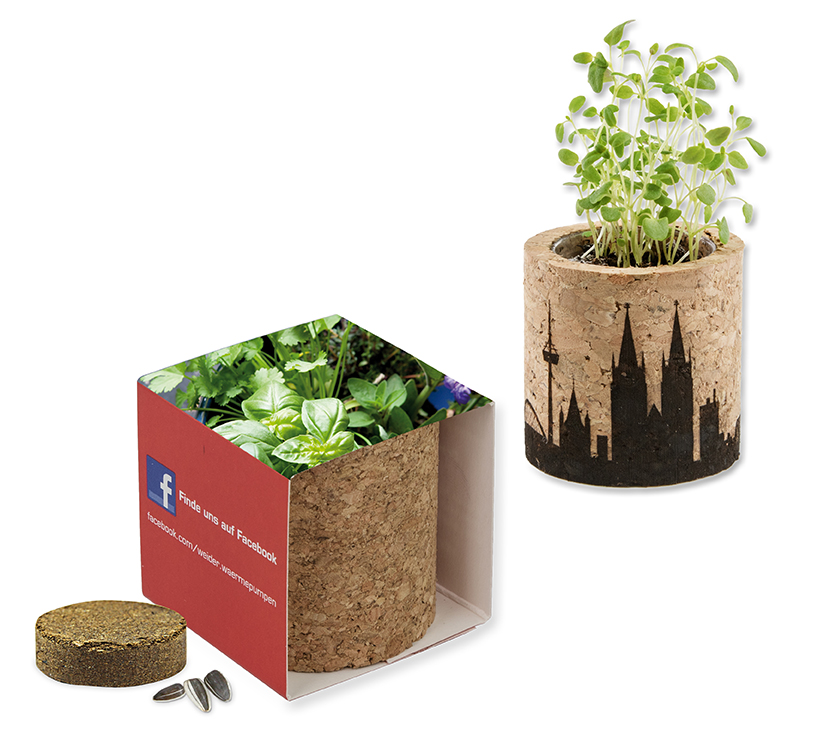 Kork ist das Trendmaterial und zeigt Ihre Naturverbundenheit. Das dekorative Pflanz-Kork rund besteht aus nachwachsendem Rohstoff und macht eine sensible Auswahl des werbenden Unternehmens sichtbar. Geliefert wird der Mini-Blumentopf mit einer Samensorte nach Wahl und einer Substrattablette als Erde. Ihre Werbung findet auf der umliegenden Banderole Platz, auch eine Lasergravur auf dem Korkgefäß ist möglich.