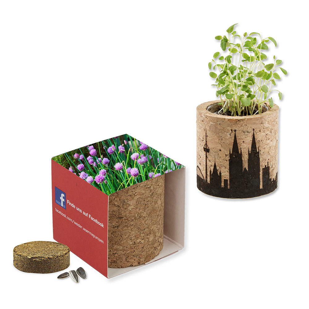 Kork ist das Trendmaterial und zeigt Ihre Naturverbundenheit. Das dekorative Pflanz-Kork rund besteht aus nachwachsendem Rohstoff und macht eine sensible Auswahl des werbenden Unternehmens sichtbar. Geliefert wird der Mini-Blumentopf mit einer Samensorte nach Wahl und einer Substrattablette als Erde. Ihre Werbung findet auf der umliegenden Banderole Platz, auch eine Lasergravur auf dem Korkgefäß ist möglich.
