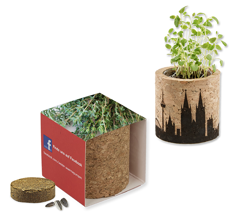 Kork ist das Trendmaterial und zeigt Ihre Naturverbundenheit. Das dekorative Pflanz-Kork rund besteht aus nachwachsendem Rohstoff und macht eine sensible Auswahl des werbenden Unternehmens sichtbar. Geliefert wird der Mini-Blumentopf mit einer Samensorte nach Wahl und einer Substrattablette als Erde. Ihre Werbung findet auf der umliegenden Banderole Platz, auch eine Lasergravur auf dem Korkgefäß ist möglich.