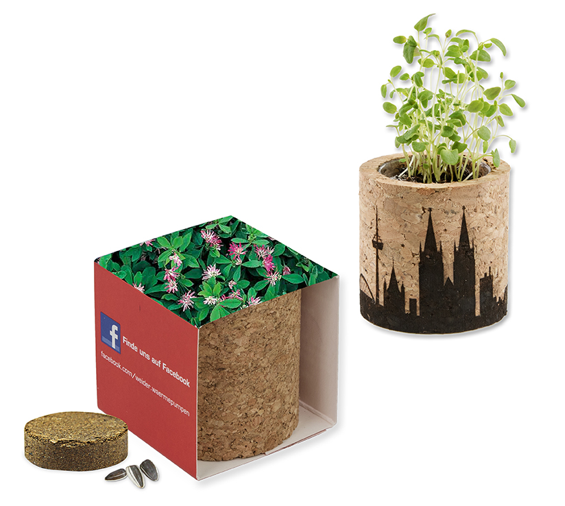 Kork ist das Trendmaterial und zeigt Ihre Naturverbundenheit. Das dekorative Pflanz-Kork rund besteht aus nachwachsendem Rohstoff und macht eine sensible Auswahl des werbenden Unternehmens sichtbar. Geliefert wird der Mini-Blumentopf mit einer Samensorte nach Wahl und einer Substrattablette als Erde. Ihre Werbung findet auf der umliegenden Banderole Platz, auch eine Lasergravur auf dem Korkgefäß ist möglich.
