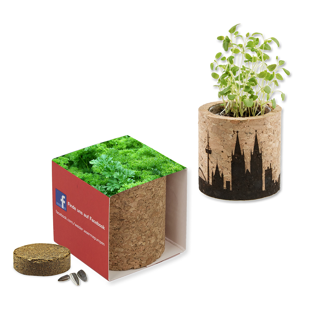 Kork ist das Trendmaterial und zeigt Ihre Naturverbundenheit. Das dekorative Pflanz-Kork rund besteht aus nachwachsendem Rohstoff und macht eine sensible Auswahl des werbenden Unternehmens sichtbar. Geliefert wird der Mini-Blumentopf mit einer Samensorte nach Wahl und einer Substrattablette als Erde. Ihre Werbung findet auf der umliegenden Banderole Platz, auch eine Lasergravur auf dem Korkgefäß ist möglich.
