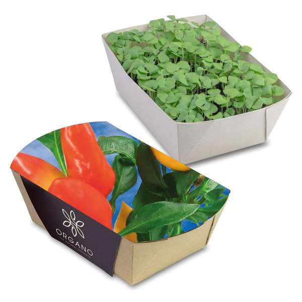 Die Schale aus Bambuspapier lädt dazu ein, eigene Kräuter anzubauen. Geliefert wird das Set mit einer Substrattablette als Erde und einer Kräutermischung (Basilikum, Majoran, Schnittlauch) oder weiteren Samen nach Wahl. Die rundum individuell bedruckte Banderole aus Papier bietet viel Platz und transportiert perfekt die Werbebotschaft.