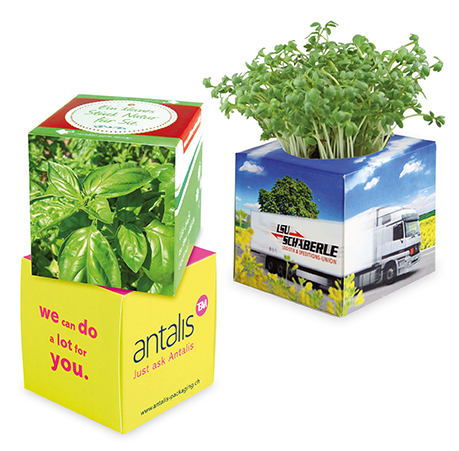 Das Geheimnis des Fliegengewichts ist der inliegende, wasserdichte Pappbecher. Darin befindet sich eine Substrattablette als Erde und der Samen des Eierbaums (weitere Samensorten siehe Hauptkatalog). Viel Platz für die Werbebotschaft bieten die fünf Seiten des umliegenden Kartonwürfels, der komplett individuell gestaltbar ist. Auf der Unterseite ist die Pflanzanleitung.