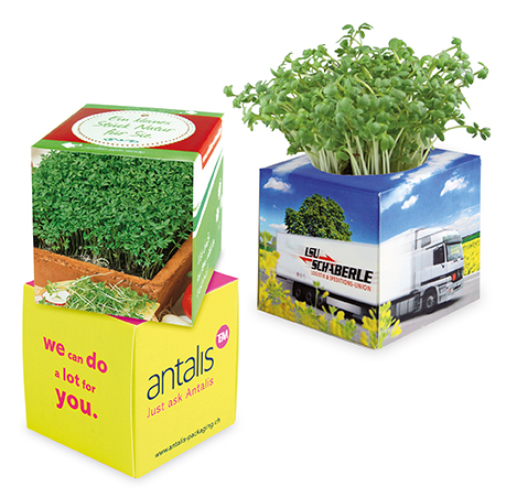 Das Geheimnis des Fliegengewichts ist der inliegende, wasserdichte Pappbecher. Darin befindet sich eine Substrattablette als Erde und der Samen des Eierbaums (weitere Samensorten siehe Hauptkatalog). Viel Platz für die Werbebotschaft bieten die fünf Seiten des umliegenden Kartonwürfels, der komplett individuell gestaltbar ist. Auf der Unterseite ist die Pflanzanleitung.