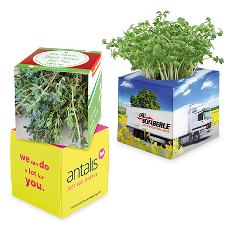 Das Geheimnis des Fliegengewichts ist der inliegende, wasserdichte Pappbecher. Darin befindet sich eine Substrattablette als Erde und der Samen des Eierbaums (weitere Samensorten siehe Hauptkatalog). Viel Platz für die Werbebotschaft bieten die fünf Seiten des umliegenden Kartonwürfels, der komplett individuell gestaltbar ist. Auf der Unterseite ist die Pflanzanleitung.