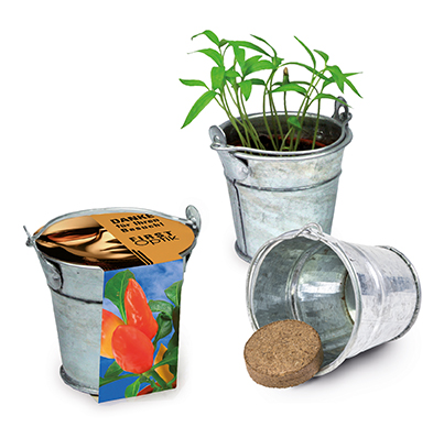Im verzinkten Metalleimerchen befindet sich eine Substrattablette als Erde und Samen nach Wahl. Mit individuell gestalteter Banderole ein echter Blickfang.