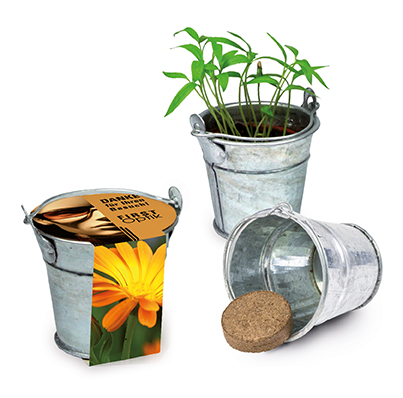 Im verzinkten Metalleimerchen befindet sich eine Substrattablette als Erde und Samen nach Wahl. Mit individuell gestalteter Banderole ein echter Blickfang.