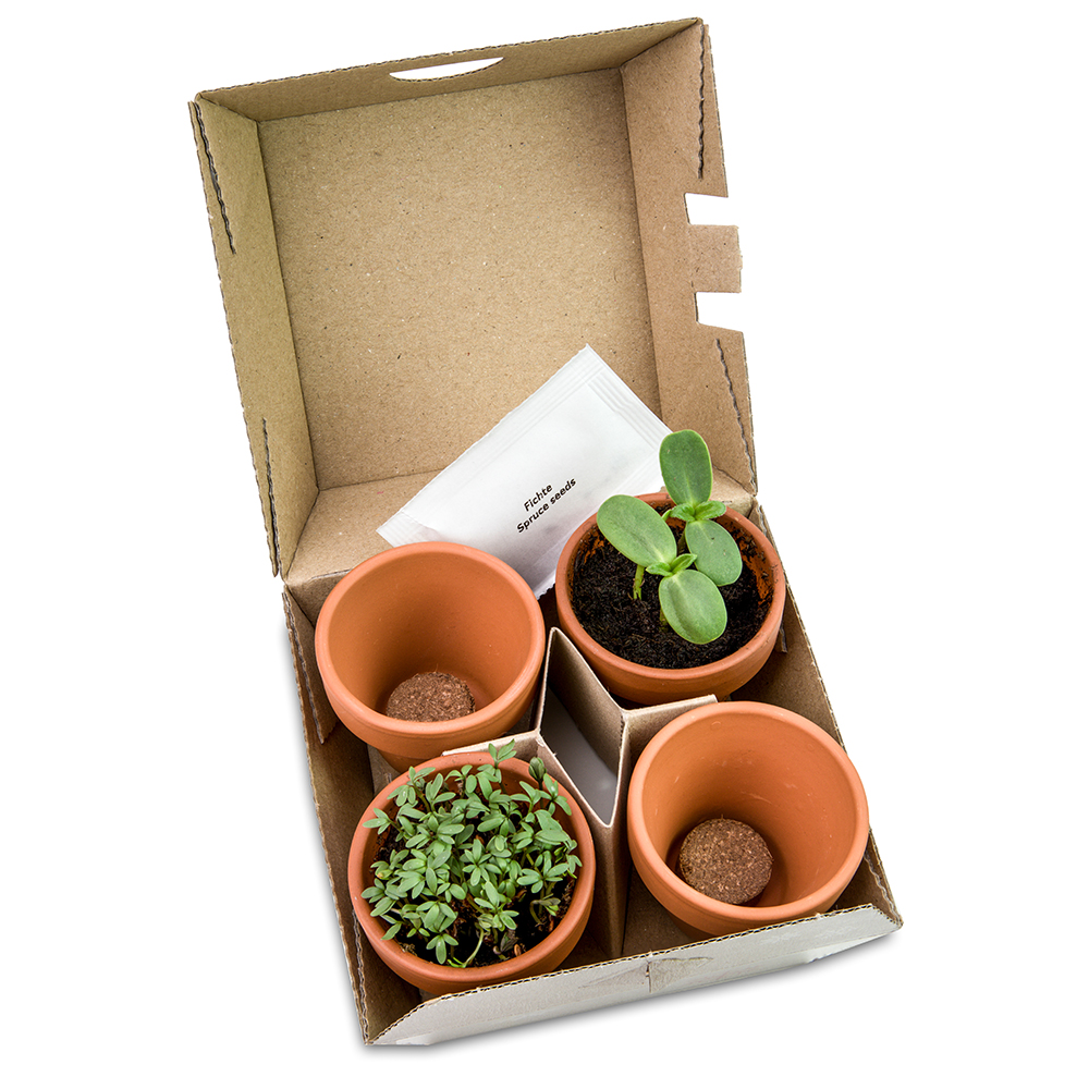 Im winterlich gestalteten Karton aus Recyclingmaterial verbirgt sich ein umweltbewusstes Pflanzen-Mix Winter-Set – ein liebevollzusammengestelltes Produkt, das dazu anregt sich aktiv mit dem Wachstum und der Pflege von Pflanzen zu beschäftigen. Denn nicht nur Bienenfreundlichkeit und Vogelschutz stehen im Fokus, sondern auch die Freude am Home Gardening und die Förderung der Tier- und Pflanzenwelt. Die Bestandteile des Pflanzen-Mix Winter-Sets werden in Deutschland und Europa produziert, um höchste Qualitätsstandards zu gewährleisten. Es enthält vier Terrakotta-Töpfchen, gefüllt mit je einer Substrattablette als Erde und vier Samensorten. Zwei der Samen im Set sind zukünftige Weihnachtsbäume (Nordmanntanne, Fichte), die der Kunde mit Liebe großziehen kann. Darüber hinaus erwarten Sie Kresse-Samen als Superfoods und fröhliche Sonnenblumensamen, die die kleinen Töpfchen zu einem Eyecatcher machen. Vervollständigt wird das Set mit der umfangreichen Pflanzanleitung, die gleichzeitig als Wachstumstagebuch dient. Die Personalisierung erfolgt über einen individuellen Werbeaufkleber auf der Außen- oder Innenseite.
