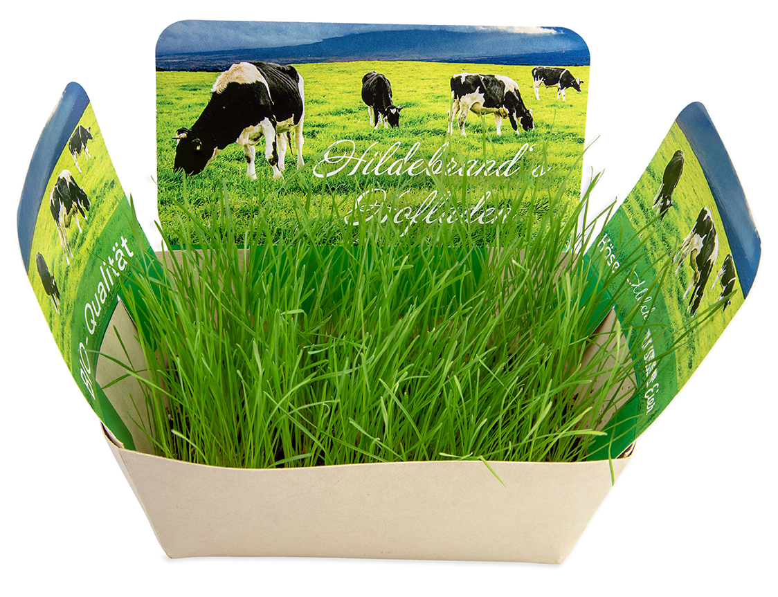 Eventcharakter in Miniaturformat bietet das Pflanzodrom. Mit dem Wortteil "drom" verbindet man große Stadien, Hallen, Gebäude und Veranstaltungen. Und genau dafür ist das Mini-Gärtchen gemacht: Mit aufgesteckten, thematisch passenden Seitenteilen entsteht beispielsweise ein Fußball- oder Sportstadion, ein Bauernhof, ein Osternest, ein Ausmalbild für Kinder oder viele weitere Gebäude und Behältnisse, die passend zur Marke, einer Veranstaltung oder einem saisonalen Thema gestaltet werden können. Außerdem wird ein weiterer Trend fokussiert: Gesunde Lebensmittel stehen im Blickpunkt der Kunden. In der Schale aus Bambuspapier können Kresse, Basilikum, Kräutermischung oder Gewürzpaprika angebaut werden. Aber ebenso Gras, Sonnenblumen und weitere Samen nach Wahl. Geliefert wird das Pflanzodrom mit einer Substrattablette als Erde und einer Samentüte. Unter der rundum individuell bedruckten Banderole liegen die individuell gestaltbaren Steckteile parat und transportieren perfekt die grüne Werbebotschaft.