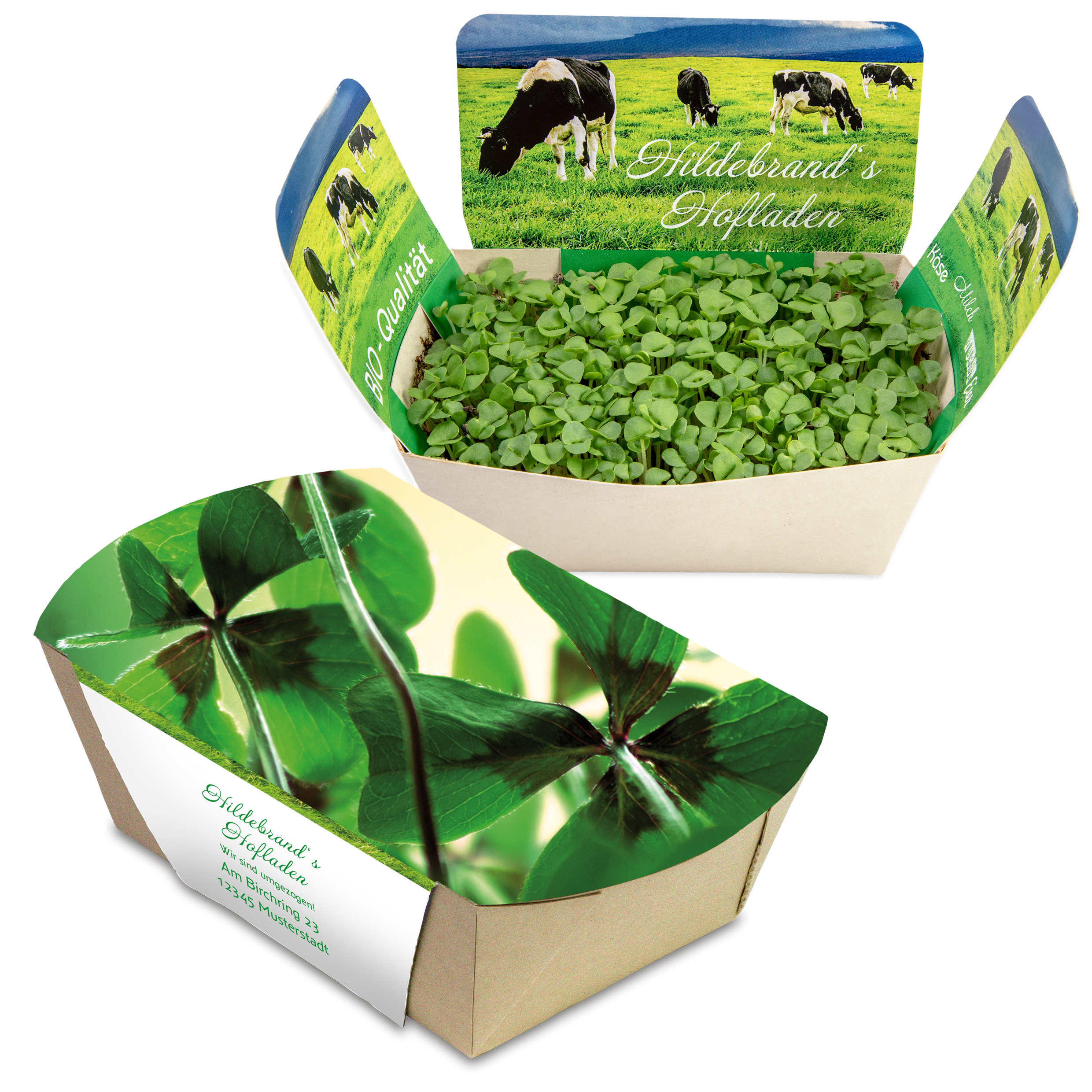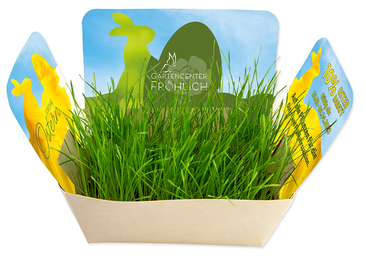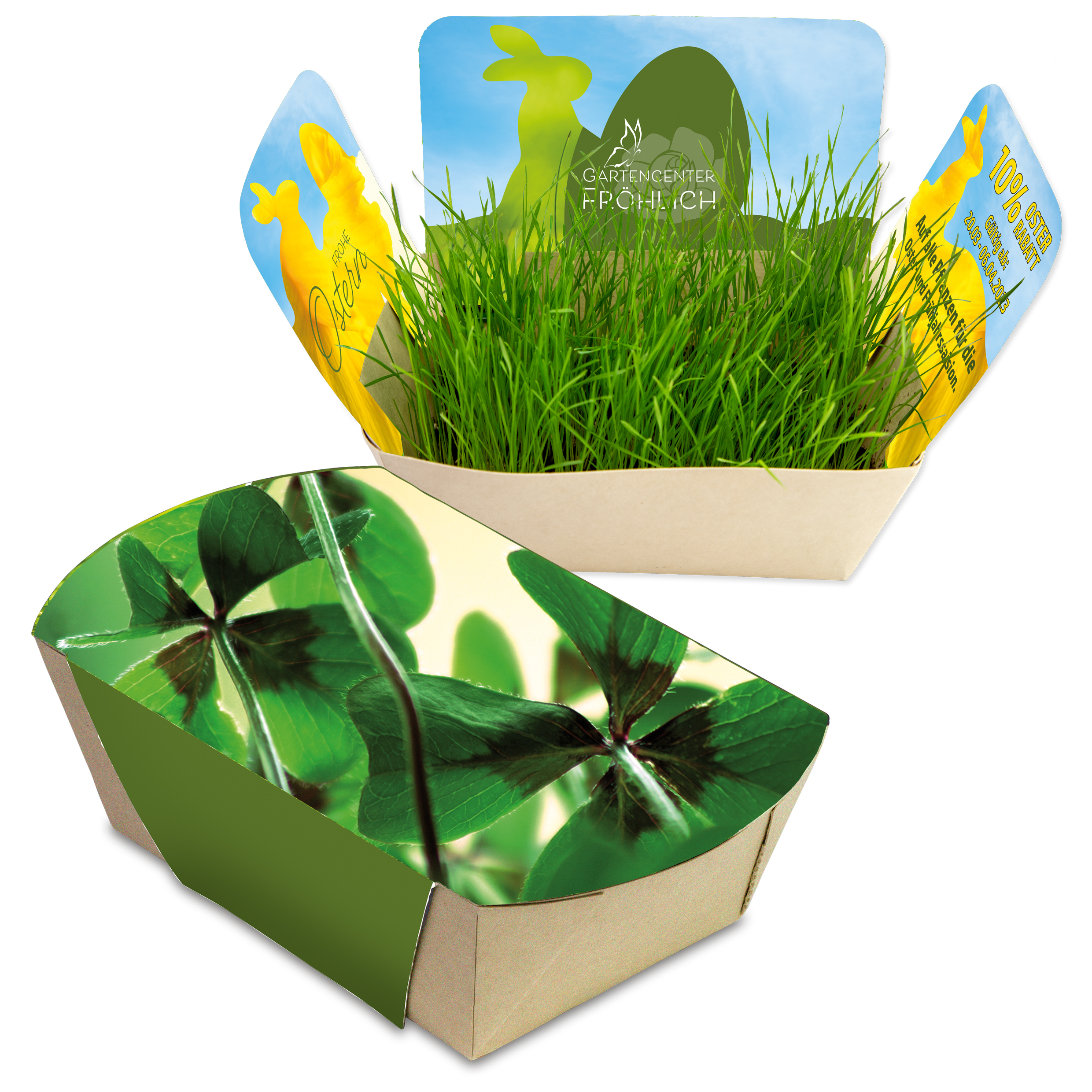 Eventcharakter in Miniaturformat bietet das Pflanzodrom. Mit dem Wortteil "drom" verbindet man große Stadien, Hallen, Gebäude und Veranstaltungen. Und genau dafür ist das Mini-Gärtchen gemacht: Mit aufgesteckten, thematisch passenden Seitenteilen entsteht beispielsweise ein Fußball- oder Sportstadion, ein Bauernhof, ein Osternest, ein Ausmalbild für Kinder oder viele weitere Gebäude und Behältnisse, die passend zur Marke, einer Veranstaltung oder einem saisonalen Thema gestaltet werden können. Außerdem wird ein weiterer Trend fokussiert: Gesunde Lebensmittel stehen im Blickpunkt der Kunden. In der Schale aus Bambuspapier können Kresse, Basilikum, Kräutermischung oder Gewürzpaprika angebaut werden. Aber ebenso Gras, Sonnenblumen und weitere Samen nach Wahl. Geliefert wird das Pflanzodrom mit einer Substrattablette als Erde und einer Samentüte. Unter der rundum individuell bedruckten Banderole liegen die individuell gestaltbaren Steckteile parat und transportieren perfekt die grüne Werbebotschaft.