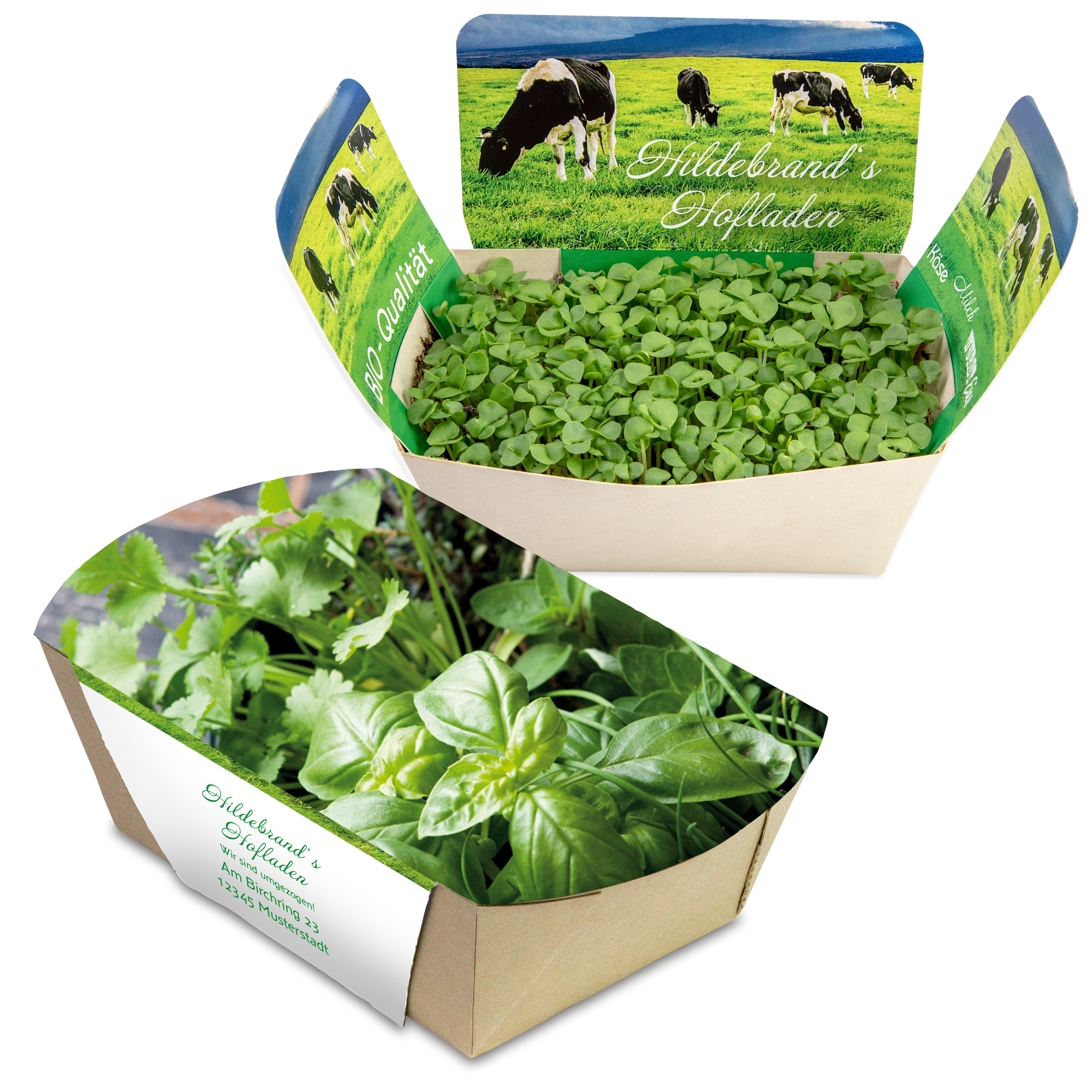Eventcharakter in Miniaturformat bietet das Pflanzodrom. Mit dem Wortteil "drom" verbindet man große Stadien, Hallen, Gebäude und Veranstaltungen. Und genau dafür ist das Mini-Gärtchen gemacht: Mit aufgesteckten, thematisch passenden Seitenteilen entsteht beispielsweise ein Fußball- oder Sportstadion, ein Bauernhof, ein Osternest, ein Ausmalbild für Kinder oder viele weitere Gebäude und Behältnisse, die passend zur Marke, einer Veranstaltung oder einem saisonalen Thema gestaltet werden können. Außerdem wird ein weiterer Trend fokussiert: Gesunde Lebensmittel stehen im Blickpunkt der Kunden. In der Schale aus Bambuspapier können Kresse, Basilikum, Kräutermischung oder Gewürzpaprika angebaut werden. Aber ebenso Gras, Sonnenblumen und weitere Samen nach Wahl. Geliefert wird das Pflanzodrom mit einer Substrattablette als Erde und einer Samentüte. Unter der rundum individuell bedruckten Banderole liegen die individuell gestaltbaren Steckteile parat und transportieren perfekt die grüne Werbebotschaft.