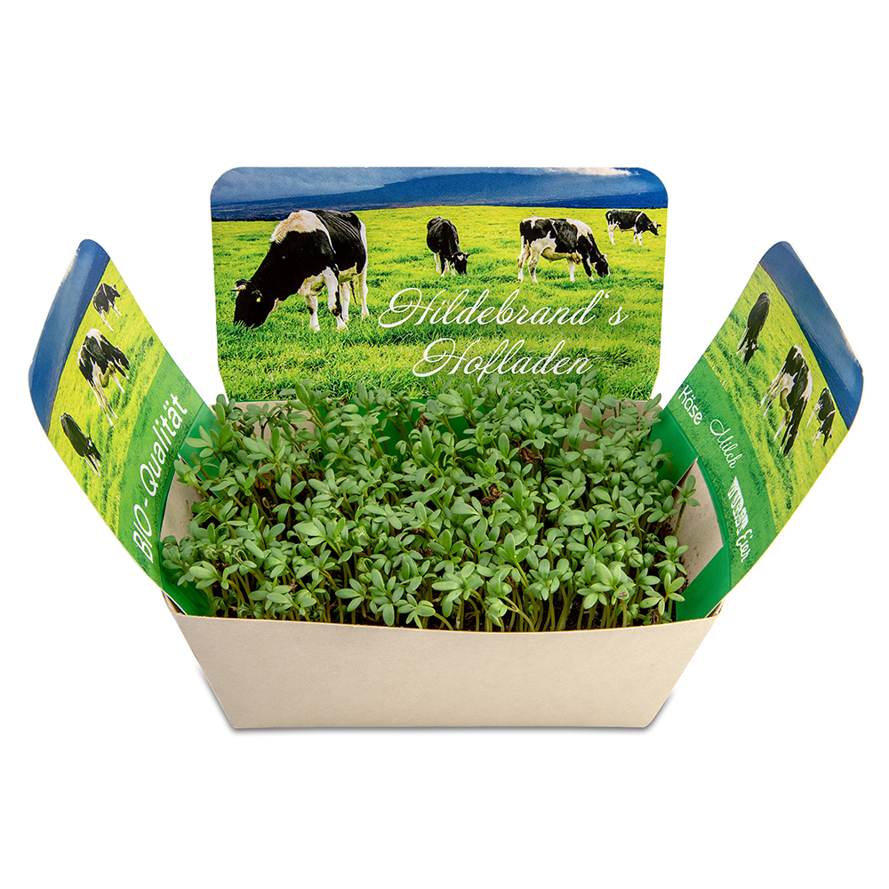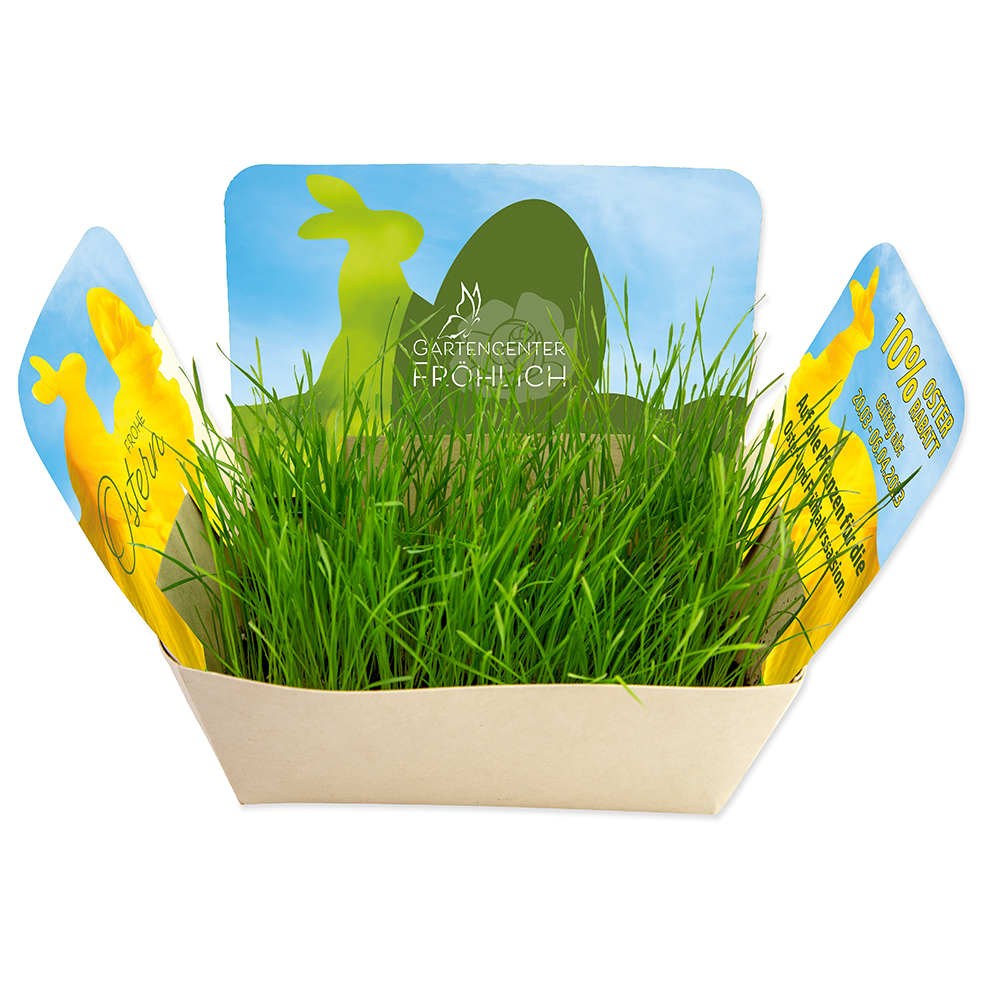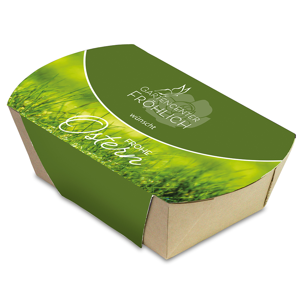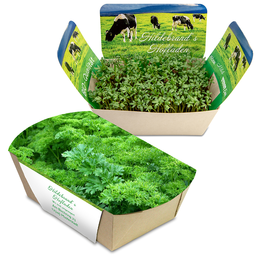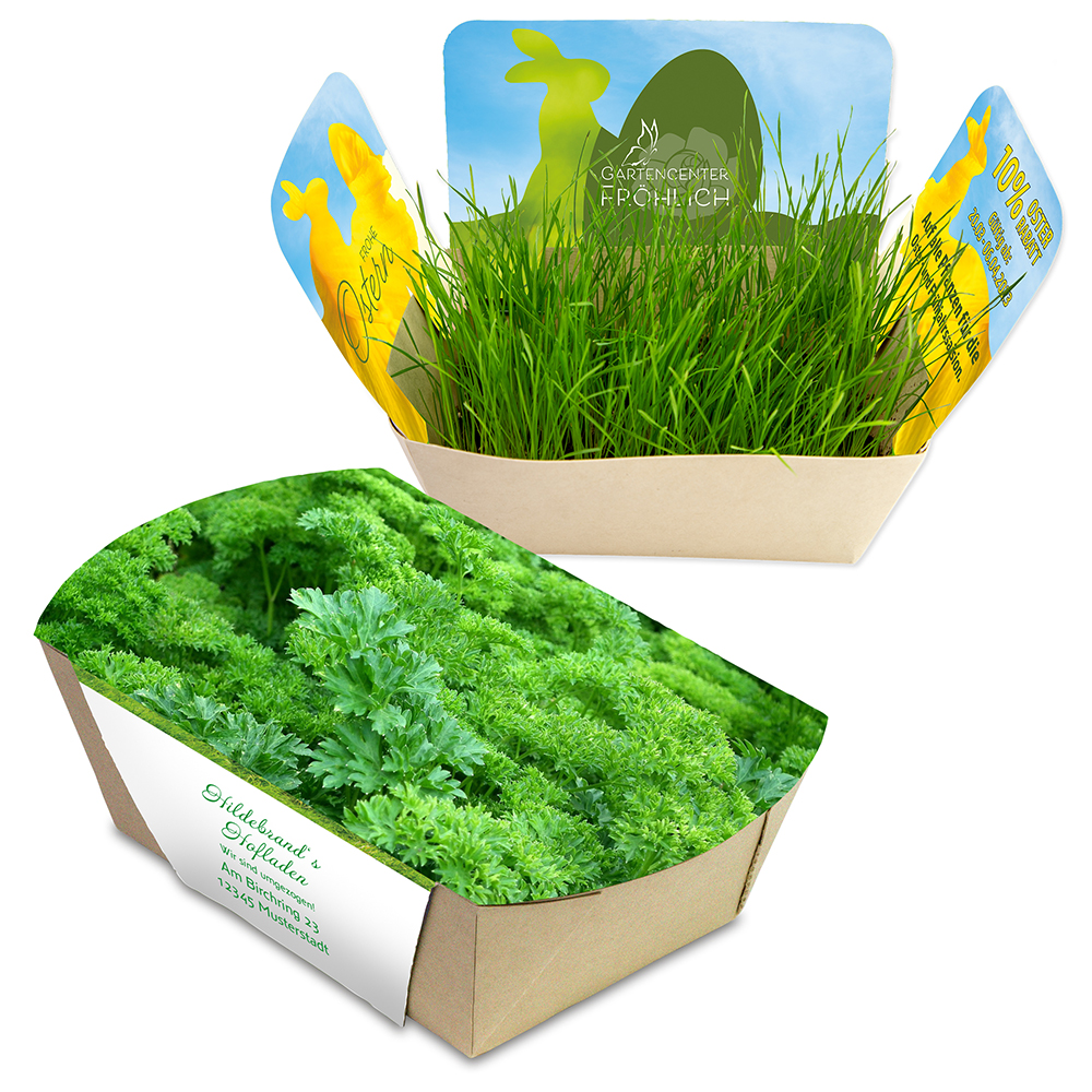 Eventcharakter in Miniaturformat bietet das Pflanzodrom. Mit dem Wortteil "drom" verbindet man große Stadien, Hallen, Gebäude und Veranstaltungen. Und genau dafür ist das Mini-Gärtchen gemacht: Mit aufgesteckten, thematisch passenden Seitenteilen entsteht beispielsweise ein Fußball- oder Sportstadion, ein Bauernhof, ein Osternest, ein Ausmalbild für Kinder oder viele weitere Gebäude und Behältnisse, die passend zur Marke, einer Veranstaltung oder einem saisonalen Thema gestaltet werden können. Außerdem wird ein weiterer Trend fokussiert: Gesunde Lebensmittel stehen im Blickpunkt der Kunden. In der Schale aus Bambuspapier können Kresse, Basilikum, Kräutermischung oder Gewürzpaprika angebaut werden. Aber ebenso Gras, Sonnenblumen und weitere Samen nach Wahl. Geliefert wird das Pflanzodrom mit einer Substrattablette als Erde und einer Samentüte. Unter der rundum individuell bedruckten Banderole liegen die individuell gestaltbaren Steckteile parat und transportieren perfekt die grüne Werbebotschaft.