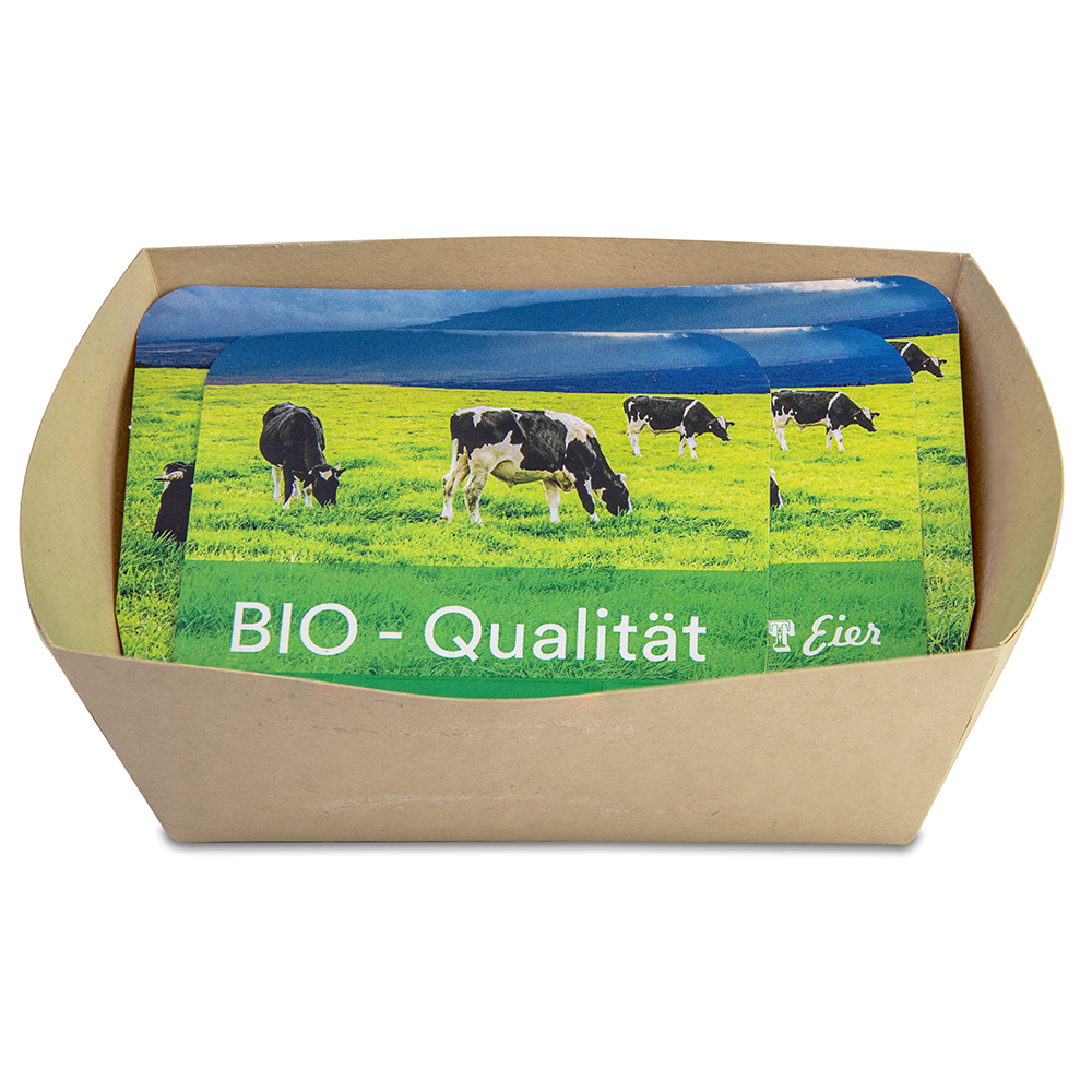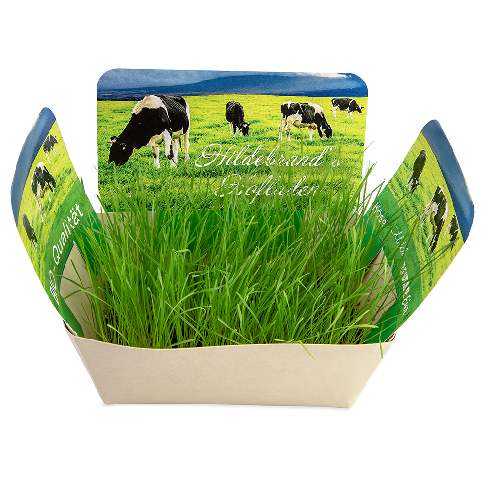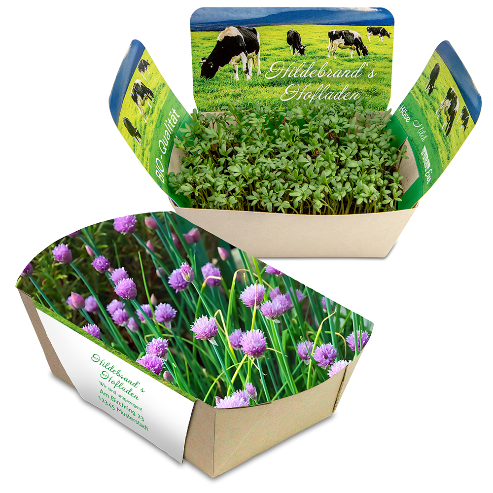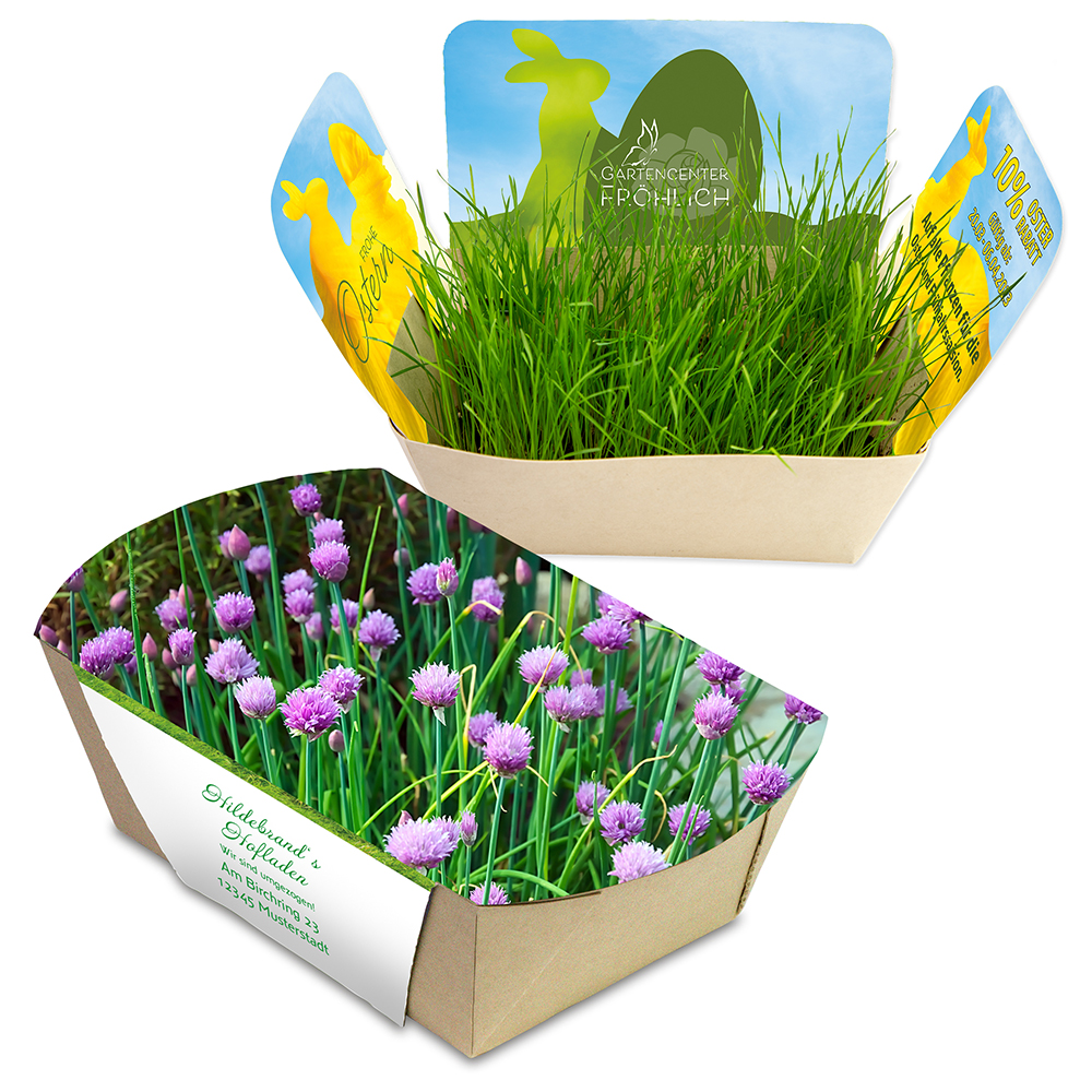 Eventcharakter in Miniaturformat bietet das Pflanzodrom. Mit dem Wortteil "drom" verbindet man große Stadien, Hallen, Gebäude und Veranstaltungen. Und genau dafür ist das Mini-Gärtchen gemacht: Mit aufgesteckten, thematisch passenden Seitenteilen entsteht beispielsweise ein Fußball- oder Sportstadion, ein Bauernhof, ein Osternest, ein Ausmalbild für Kinder oder viele weitere Gebäude und Behältnisse, die passend zur Marke, einer Veranstaltung oder einem saisonalen Thema gestaltet werden können. Außerdem wird ein weiterer Trend fokussiert: Gesunde Lebensmittel stehen im Blickpunkt der Kunden. In der Schale aus Bambuspapier können Kresse, Basilikum, Kräutermischung oder Gewürzpaprika angebaut werden. Aber ebenso Gras, Sonnenblumen und weitere Samen nach Wahl. Geliefert wird das Pflanzodrom mit einer Substrattablette als Erde und einer Samentüte. Unter der rundum individuell bedruckten Banderole liegen die individuell gestaltbaren Steckteile parat und transportieren perfekt die grüne Werbebotschaft.