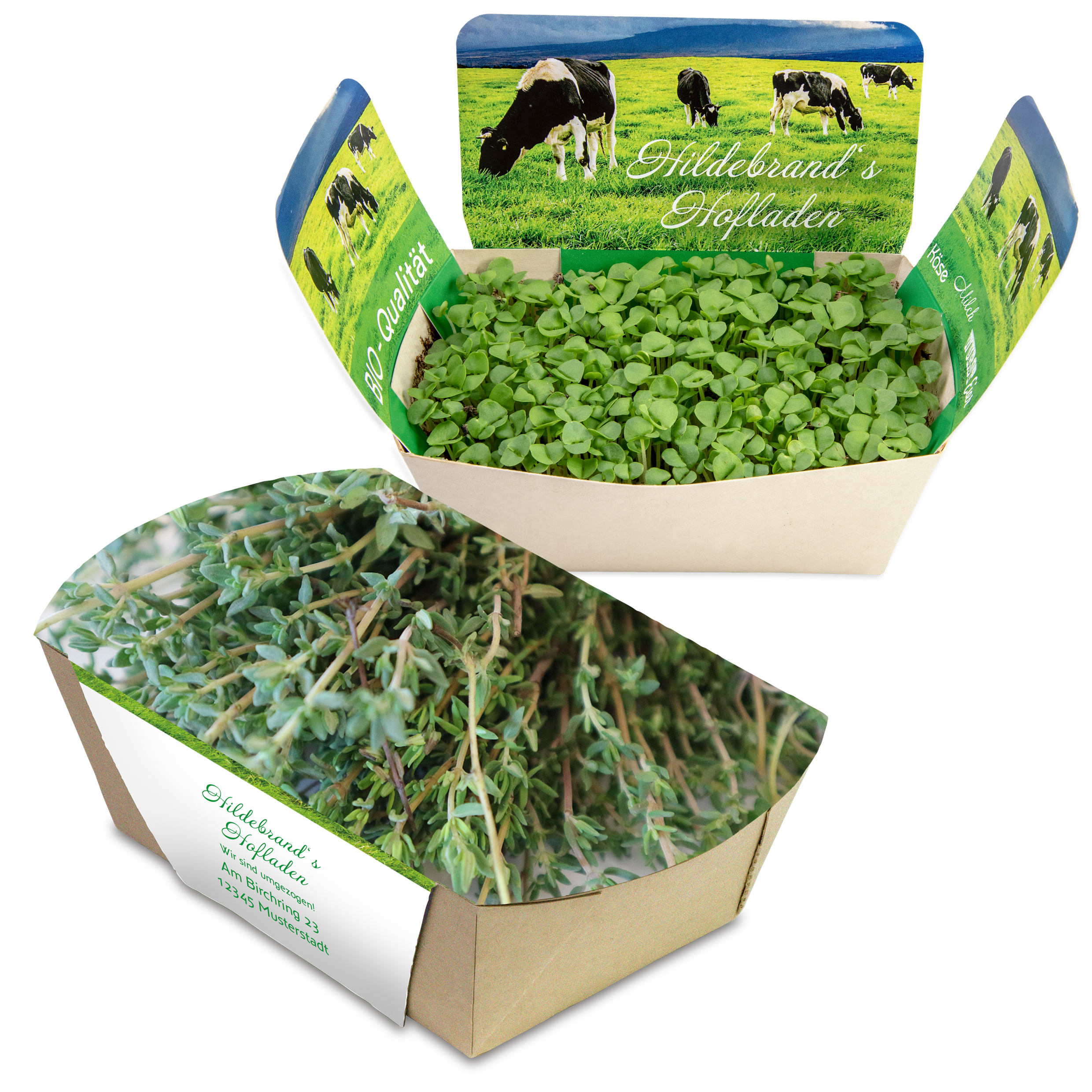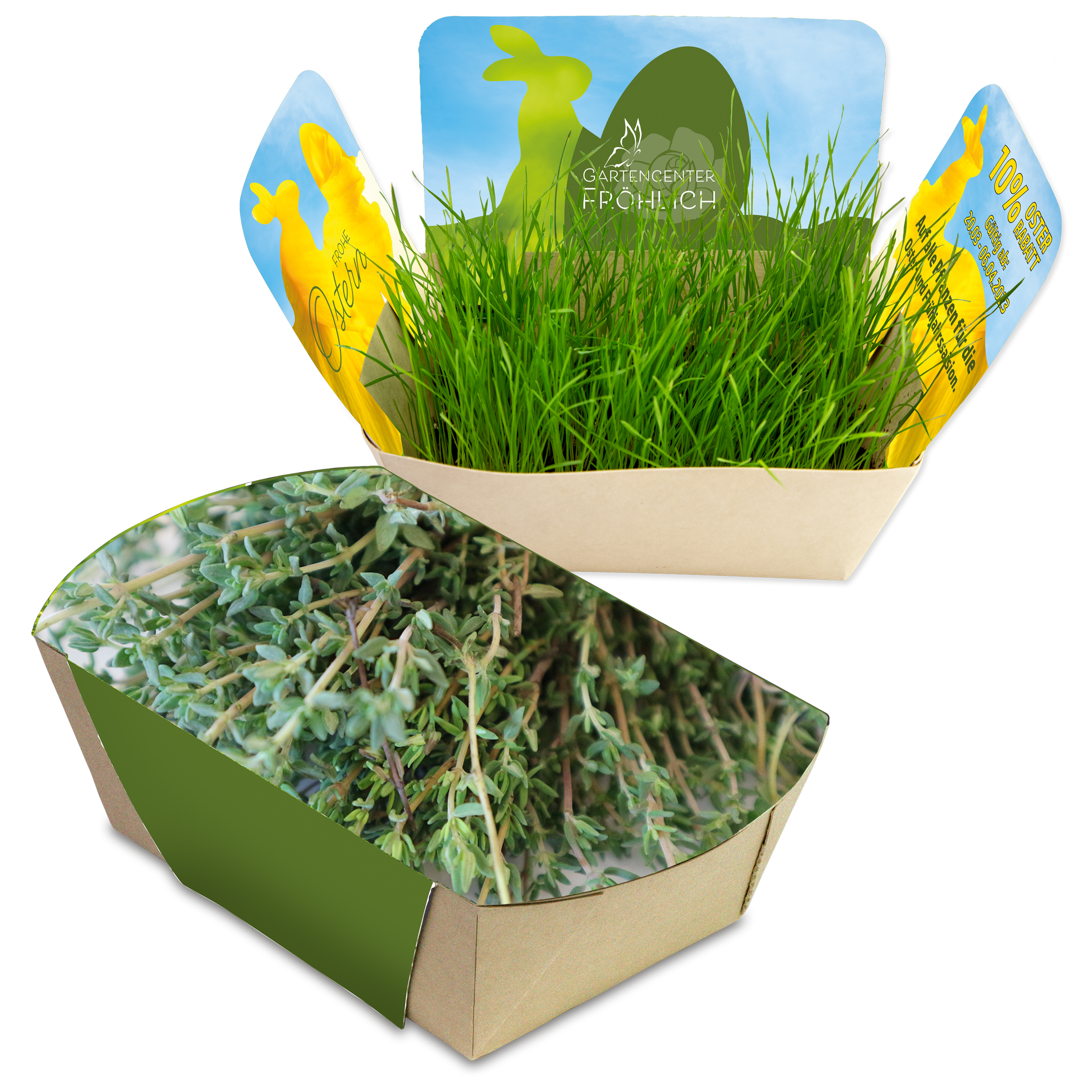 Eventcharakter in Miniaturformat bietet das Pflanzodrom. Mit dem Wortteil "drom" verbindet man große Stadien, Hallen, Gebäude und Veranstaltungen. Und genau dafür ist das Mini-Gärtchen gemacht: Mit aufgesteckten, thematisch passenden Seitenteilen entsteht beispielsweise ein Fußball- oder Sportstadion, ein Bauernhof, ein Osternest, ein Ausmalbild für Kinder oder viele weitere Gebäude und Behältnisse, die passend zur Marke, einer Veranstaltung oder einem saisonalen Thema gestaltet werden können. Außerdem wird ein weiterer Trend fokussiert: Gesunde Lebensmittel stehen im Blickpunkt der Kunden. In der Schale aus Bambuspapier können Kresse, Basilikum, Kräutermischung oder Gewürzpaprika angebaut werden. Aber ebenso Gras, Sonnenblumen und weitere Samen nach Wahl. Geliefert wird das Pflanzodrom mit einer Substrattablette als Erde und einer Samentüte. Unter der rundum individuell bedruckten Banderole liegen die individuell gestaltbaren Steckteile parat und transportieren perfekt die grüne Werbebotschaft.