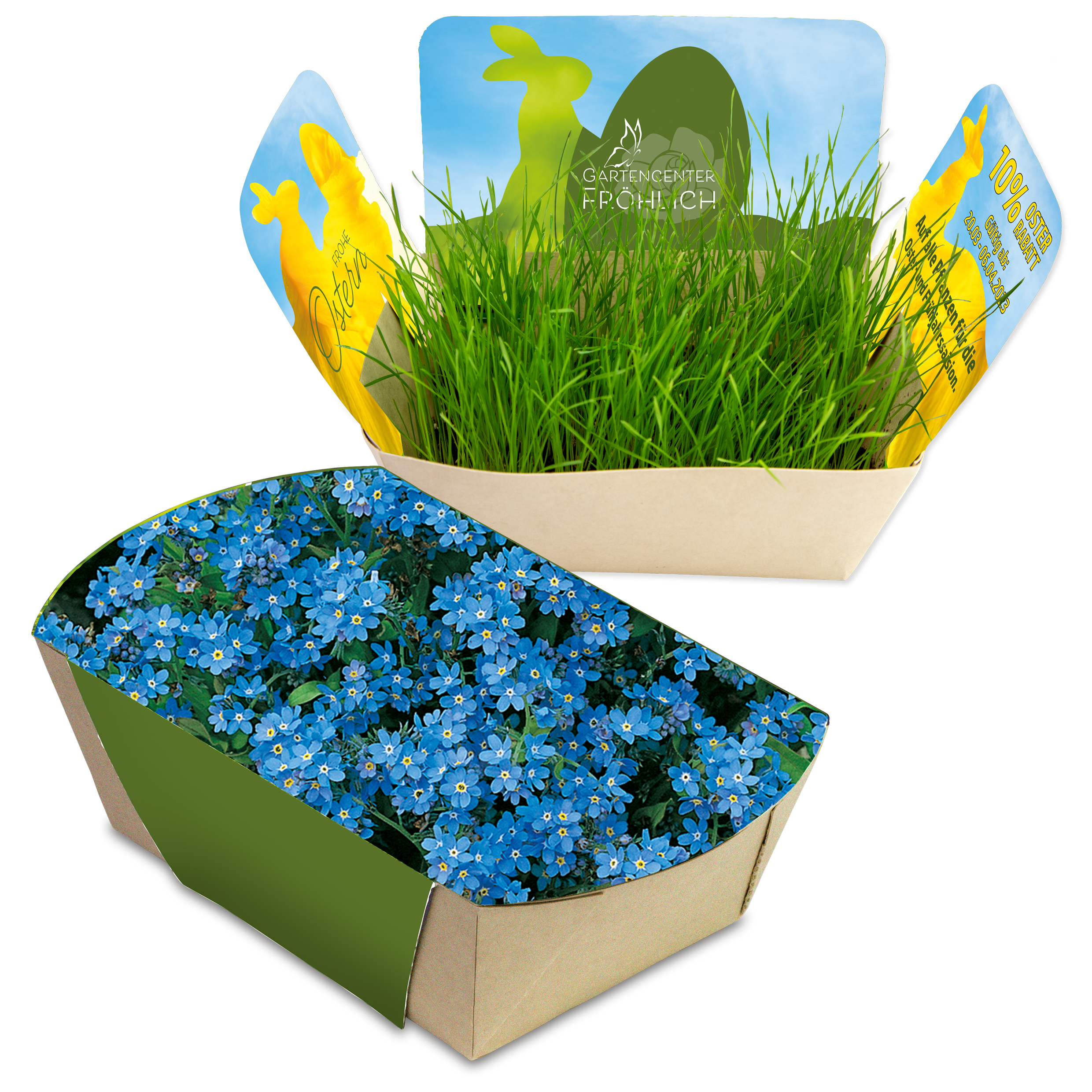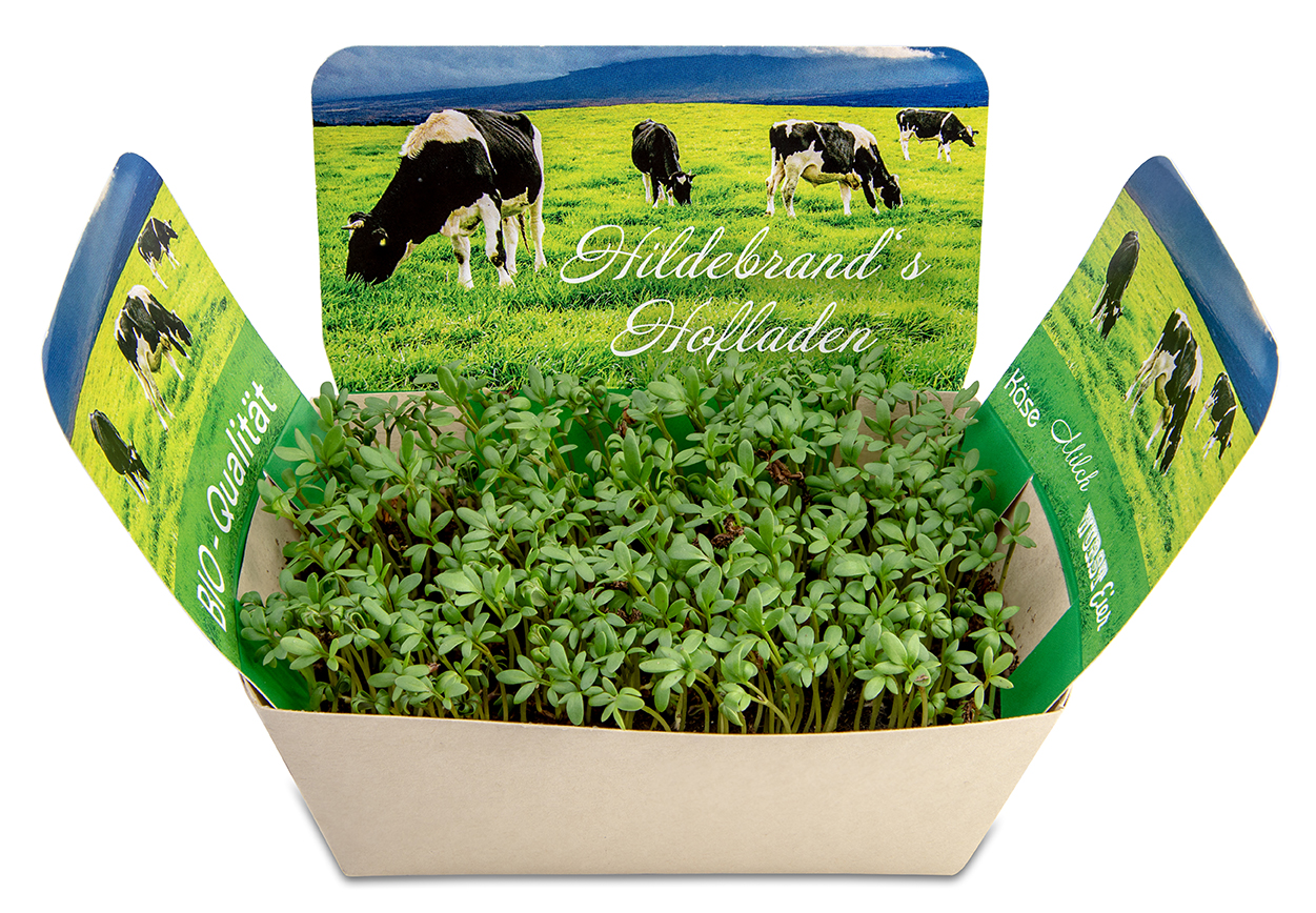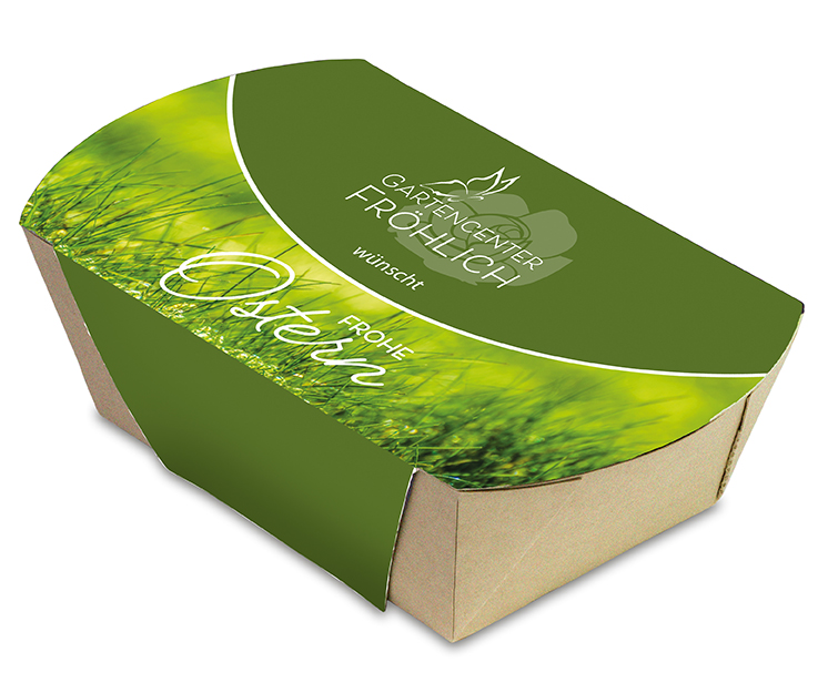 Eventcharakter in Miniaturformat bietet das Pflanzodrom. Mit dem Wortteil "drom" verbindet man große Stadien, Hallen, Gebäude und Veranstaltungen. Und genau dafür ist das Mini-Gärtchen gemacht: Mit aufgesteckten, thematisch passenden Seitenteilen entsteht beispielsweise ein Fußball- oder Sportstadion, ein Bauernhof, ein Osternest, ein Ausmalbild für Kinder oder viele weitere Gebäude und Behältnisse, die passend zur Marke, einer Veranstaltung oder einem saisonalen Thema gestaltet werden können. Außerdem wird ein weiterer Trend fokussiert: Gesunde Lebensmittel stehen im Blickpunkt der Kunden. In der Schale aus Bambuspapier können Kresse, Basilikum, Kräutermischung oder Gewürzpaprika angebaut werden. Aber ebenso Gras, Sonnenblumen und weitere Samen nach Wahl. Geliefert wird das Pflanzodrom mit einer Substrattablette als Erde und einer Samentüte. Unter der rundum individuell bedruckten Banderole liegen die individuell gestaltbaren Steckteile parat und transportieren perfekt die grüne Werbebotschaft.