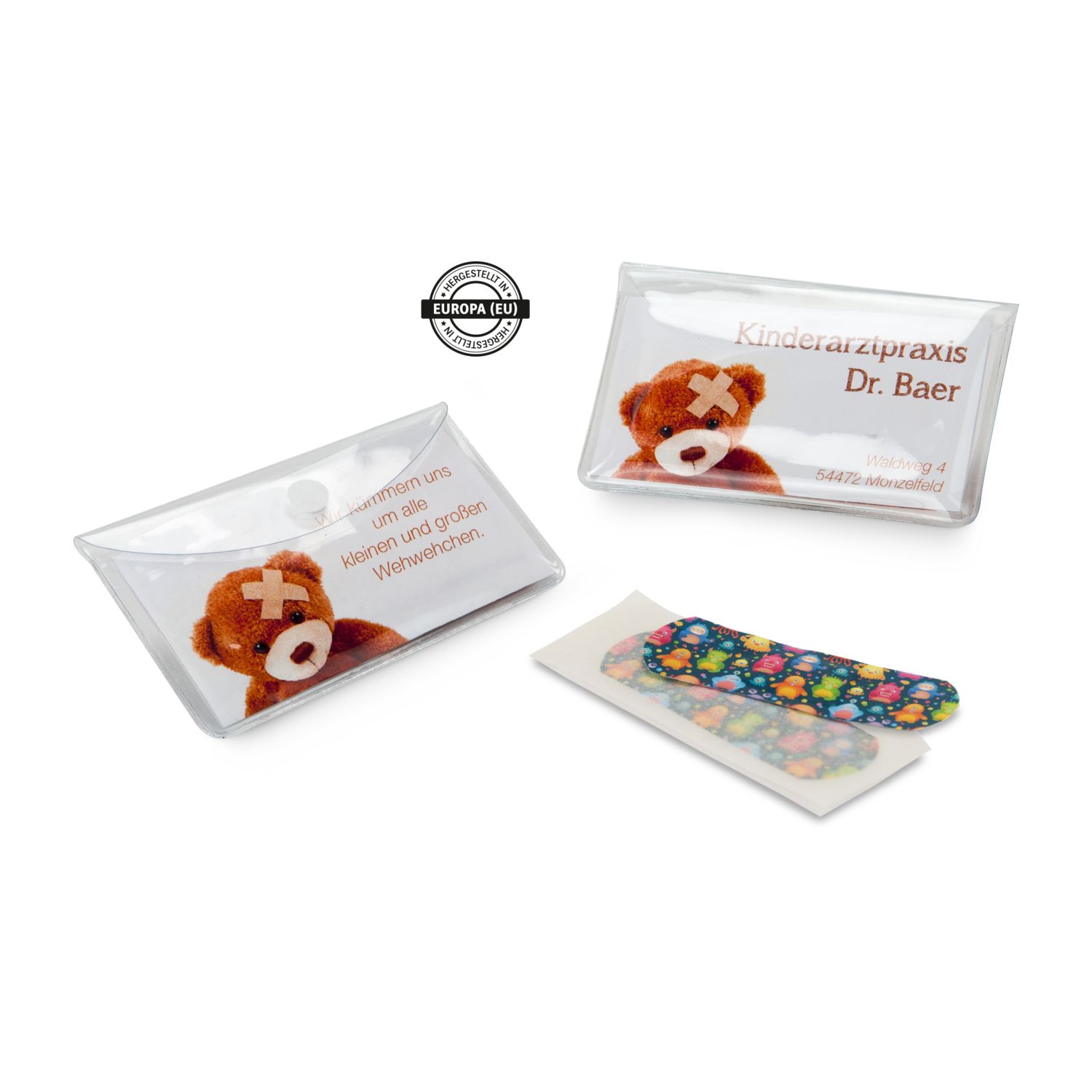 10 Pflaster im PVC-Mäppchen (ca. 104 x 60 mm), Preise incl. 4c Einleger! - Mit dem Pflastermäppchen PVC ist die erste Hilfe bei Schnittwunden oder Abschürfungen schnell zur Hand. Die Mäppchen passen bequem in jede Tasche und sind somit ideal für unterwegs! Das Mäppchen ist mit 10 Qualitätspflasterstreifen (ca. 60 x 20 mm) befüllt. Die Pflaster, hergestellt in Europa, sind einzeln in einer Schutzfolie versiegelt. Der Einleger lässt sich im Digitaldruck individuell nach Kundenwunsch bedrucken, was es zu einem günstigen und wirkungsvollen Werbemittel macht. Durch die geringen Maße und das leichte Gewicht bietet sich dieser günstige zugleich nützliche Streuartikel für ein Mailing geradezu an. Als Inhalt können Sie zwischen 10 Standardpflastern hergestellt in Europa, 10 Monster-Pflastern für Kinder hergestellt in Europa, 10 Sensitiv Markenpflastern (Made in Germany) oder 4 Blasenpflastern hergestellt in Europa wählen.