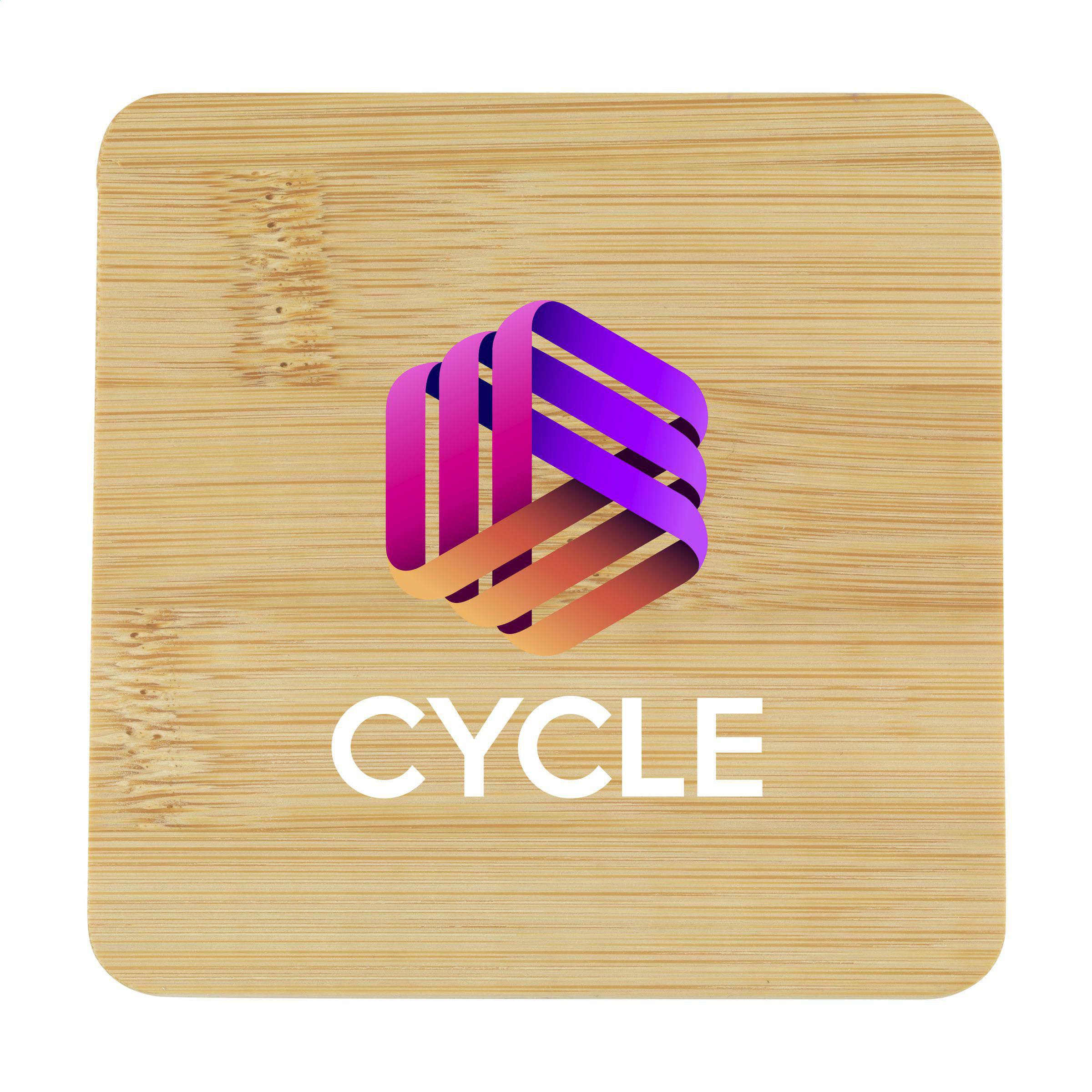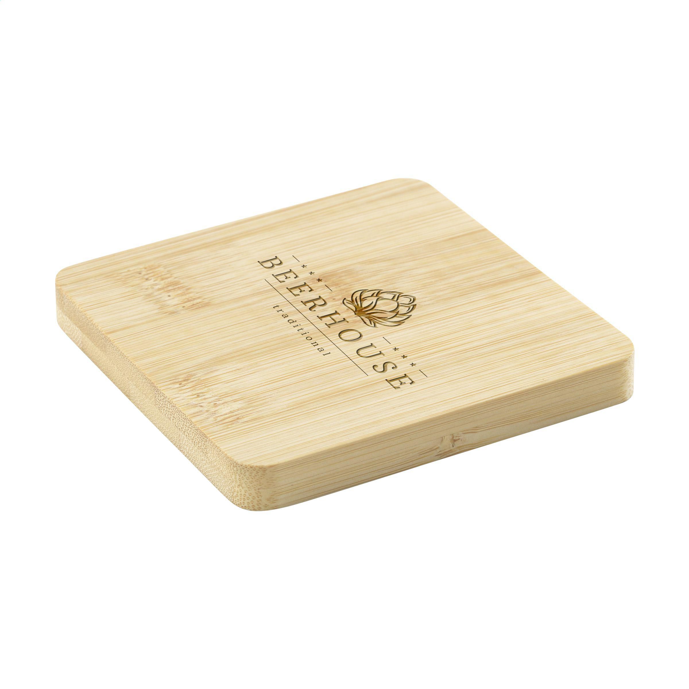 Quadratischer Untersetzer aus Bambus mit Flaschenöffner aus Metall an der Unterseite. Praktisch und multifunktional. Bambus ist ein natürliches Material. Deshalb kann die Farbe je nach Produkt variieren.