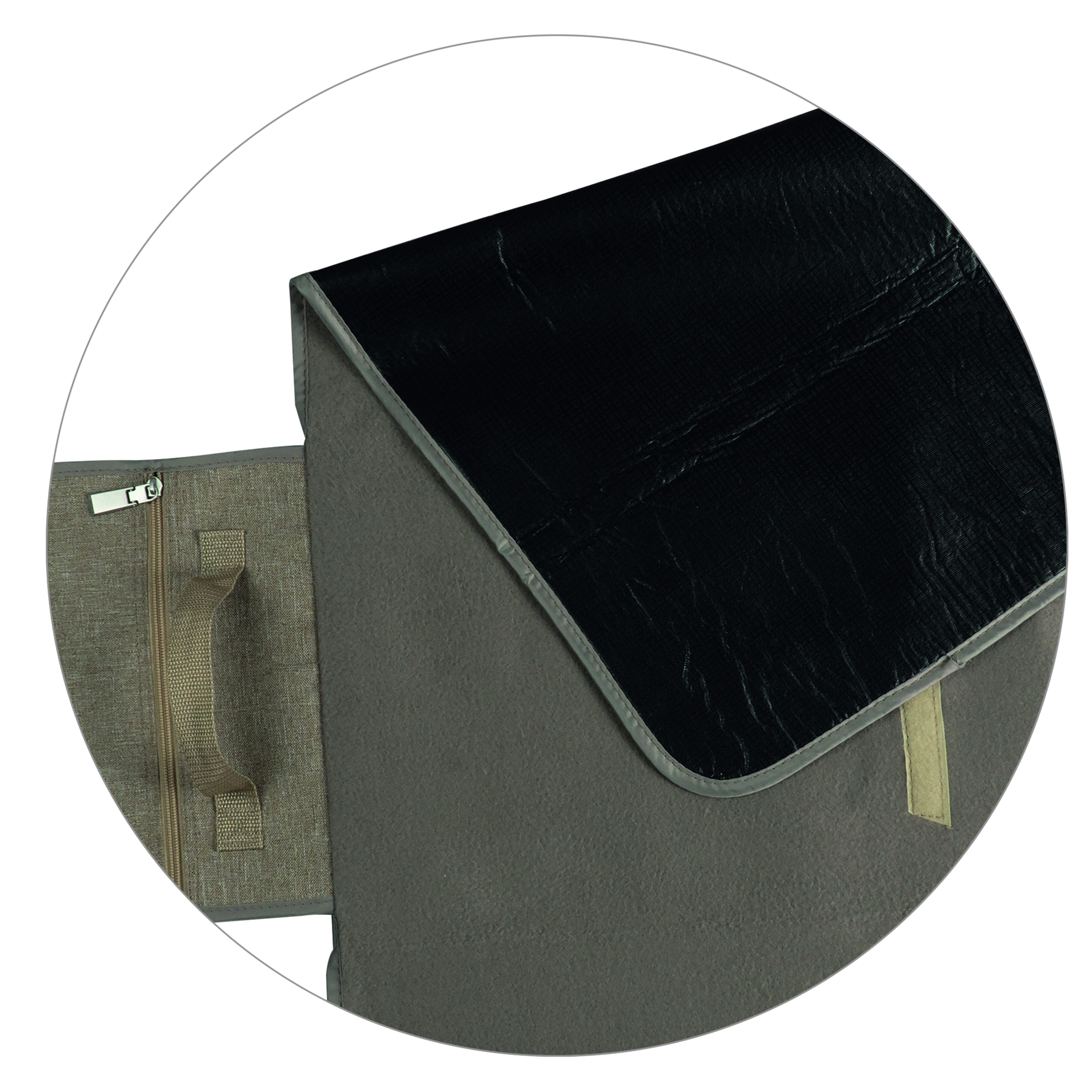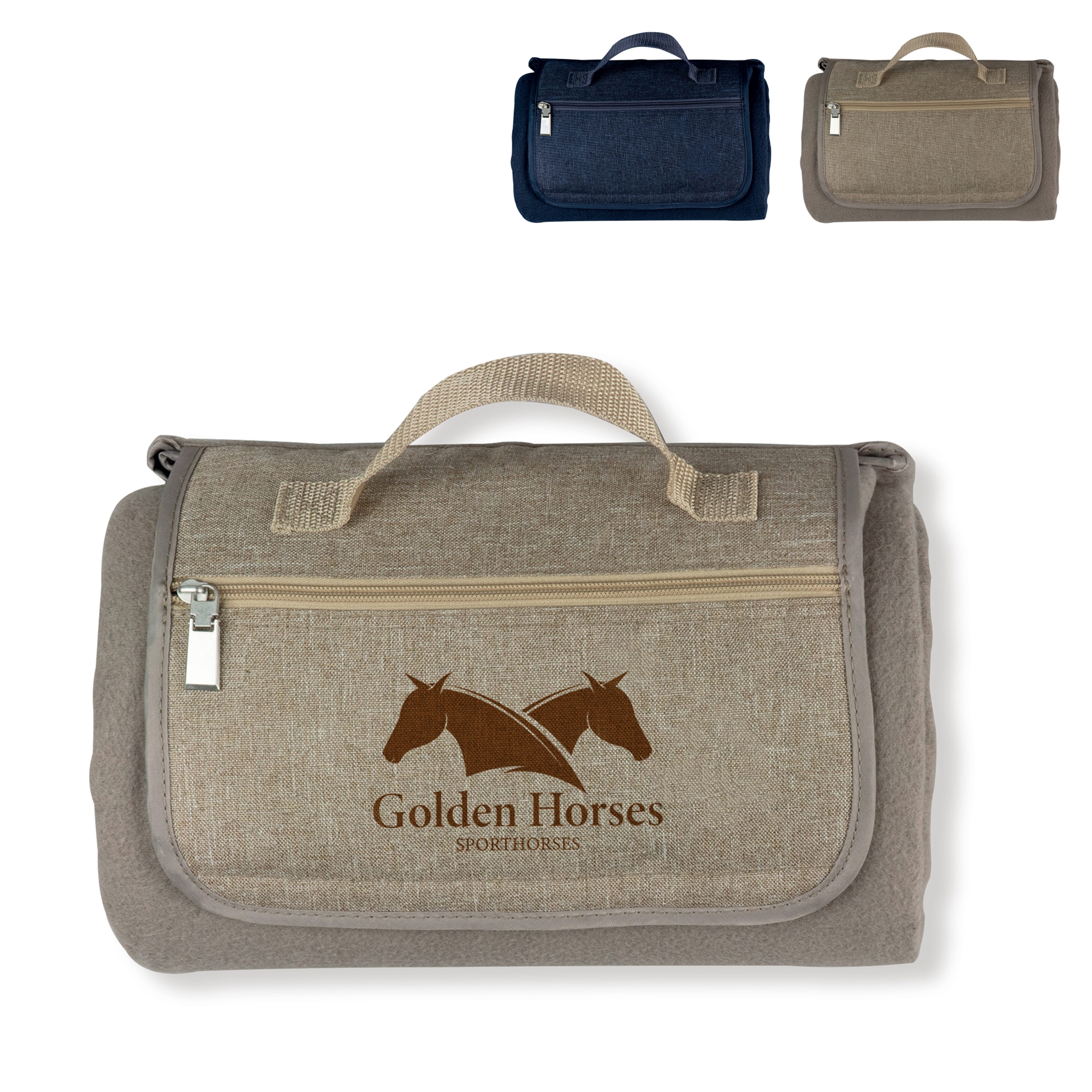 Bequeme Picknick-Decke aus weichem Fleece-Stoff mit einer wasserabweisenden Rückseite. Die Tasche hat ein Fach mit Reißverschluss wo kleine Gegenstände verstaut werden können und der angebrachte Griff erleichtert das Tragen.