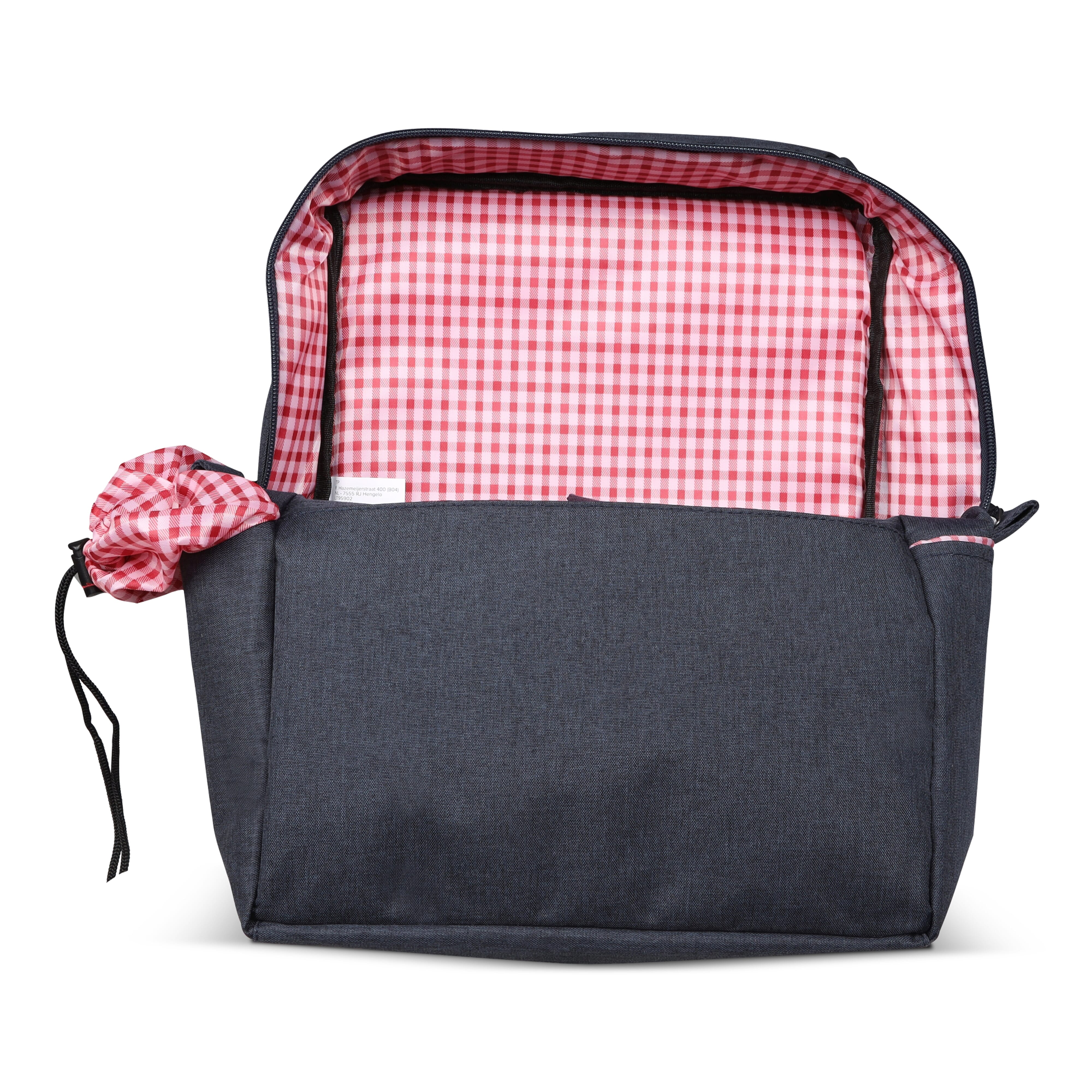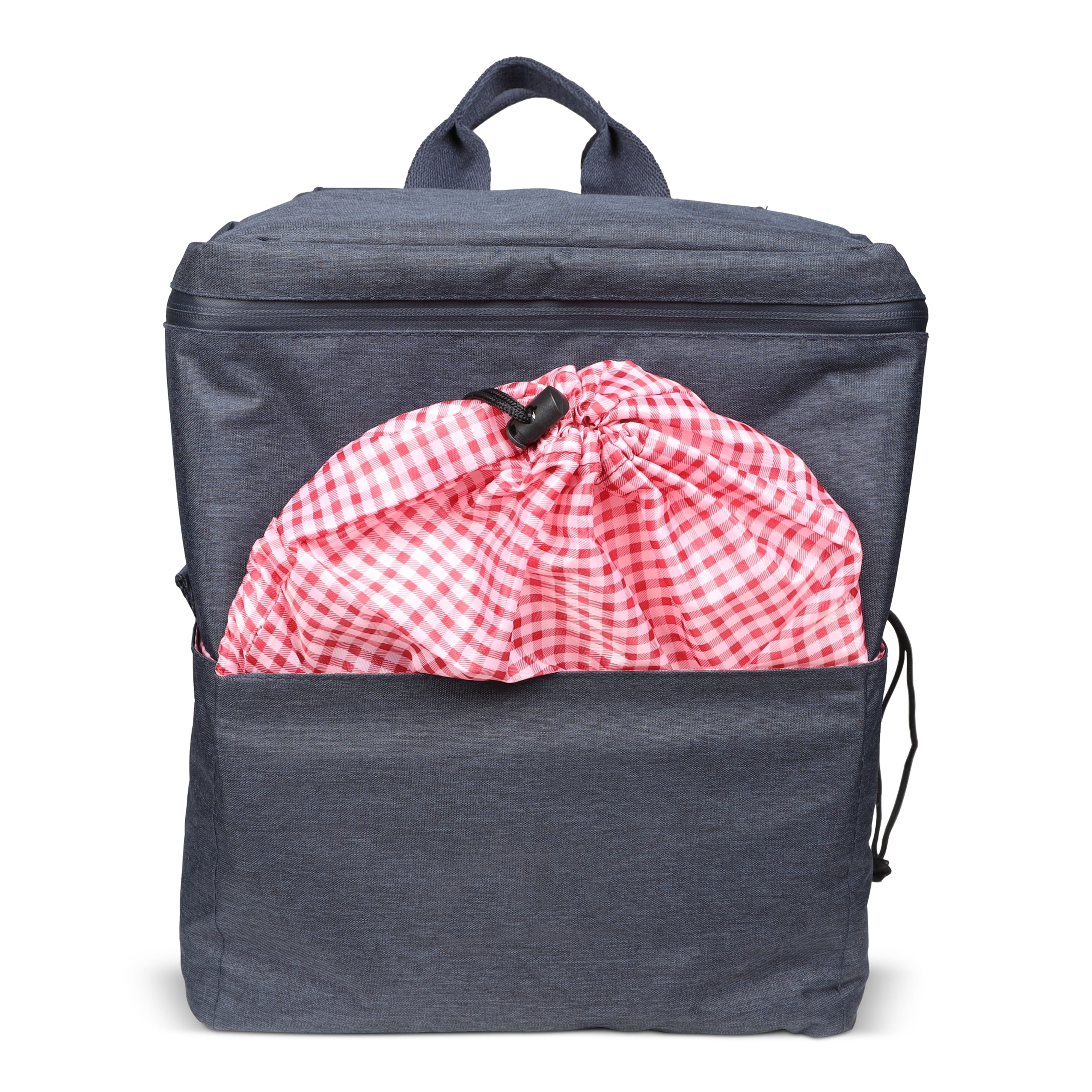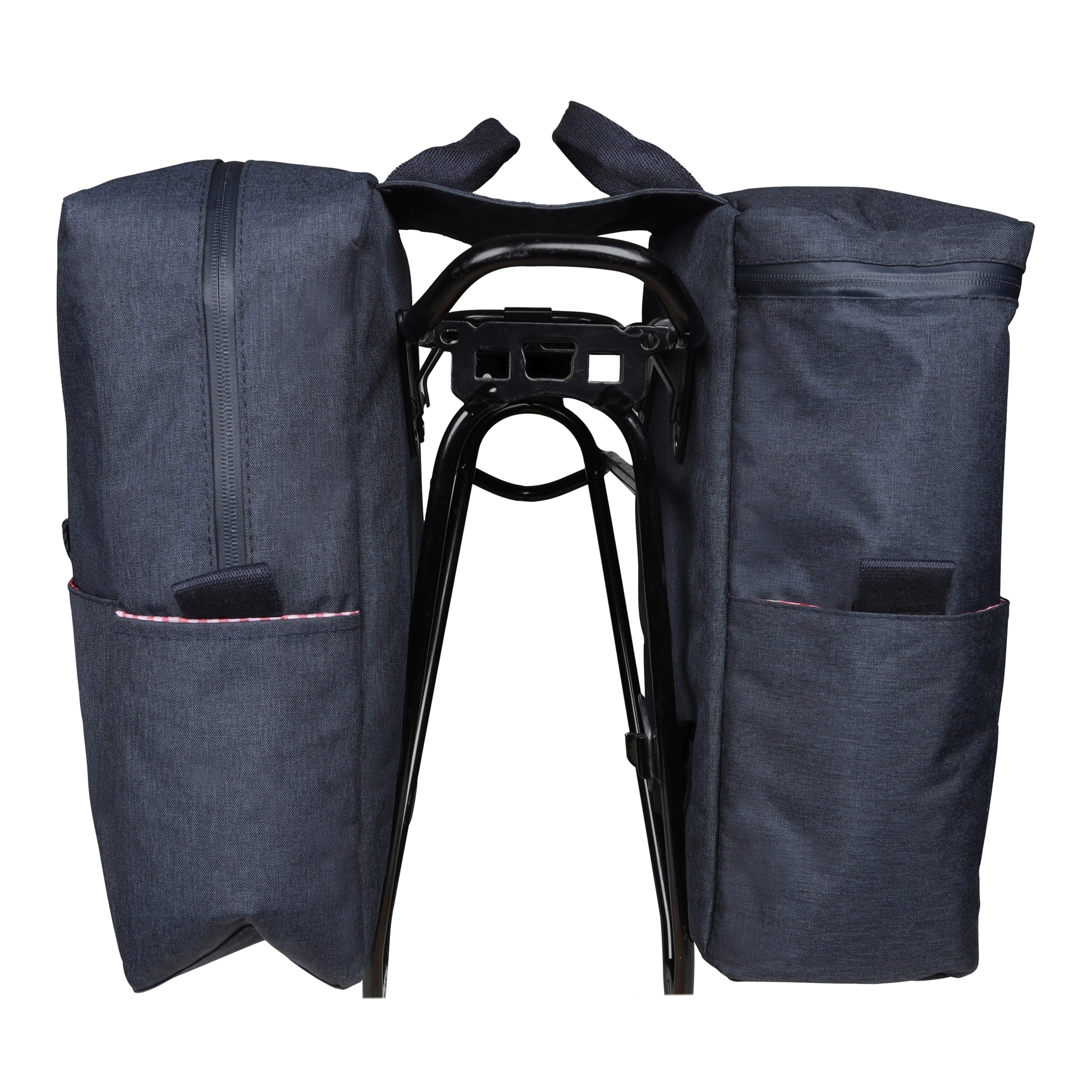 Doppelte Fahrradtasche aus meliertem R-PET-Material. Eine Fahrradtasche ist isoliert und hält Speisen und Getränke unterwegs kühl. Die andere Tasche bietet Platz für ein komplettes Geschirrset für 4 Personen. Das glatte karierte Innenfutter verleiht der Fahrradtasche ein ansprechendes Aussehen. Auf einer Seite ist eine Halterung angebracht für z. B. eine Flasche Wein.