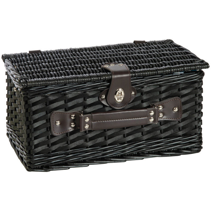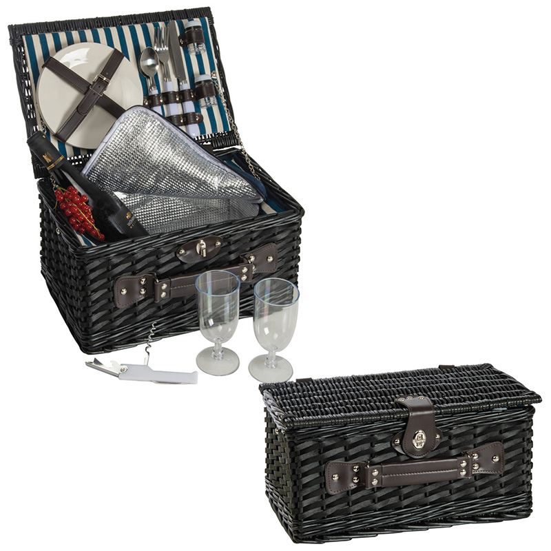 Mini-Picknick-Kühlkorb aus Weidengeflecht für zwei Personen mit Keramiktellern und -tassen, Edelstahlbesteck und Salz- und Pfefferstreuer. Ihre Werbung lasern wir auf ein Metallemblem, dass dann am Korb befestigt wird.