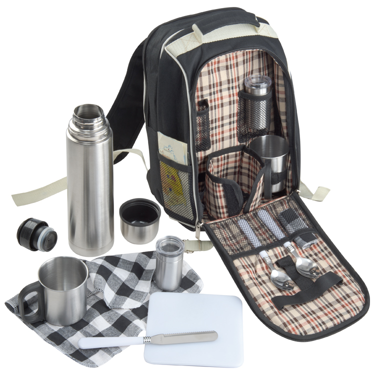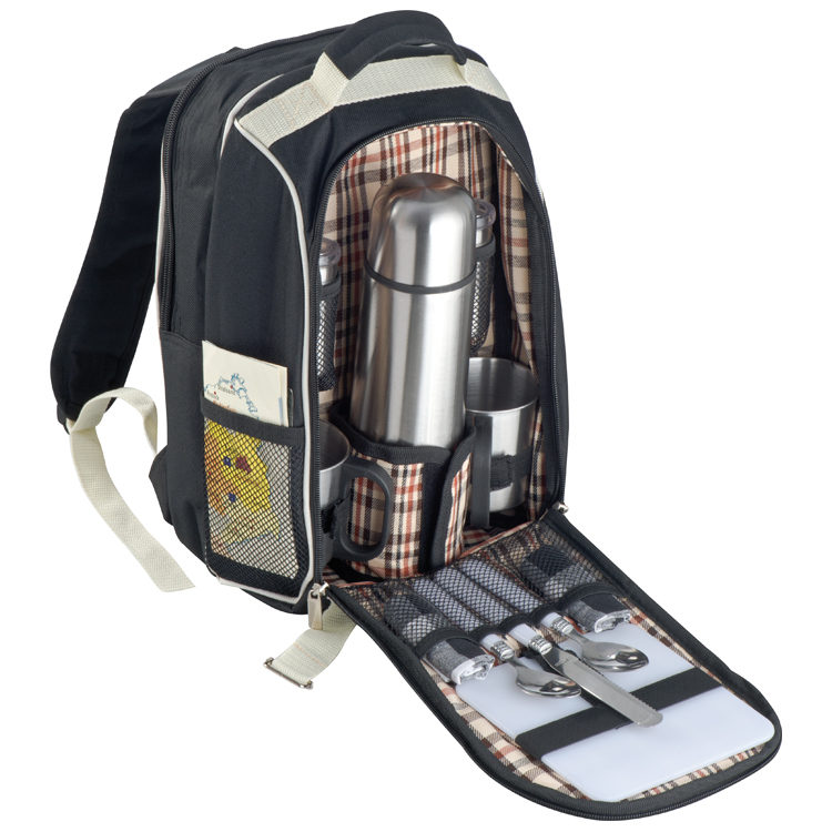 Picknickrucksack mit Kühlfach, Innenfach mit Edelstahlisolierkanne (Fassungsvolumen 1.000ml), zwei Edelstahltassen 200ml, Salz- und Pfefferstreuer, Brotzeitbrett, Besteck und Servietten. Ihre Werbung drucken wir auf das Vorderfach. Die Decke im Beispielfoto wird nicht mitgeliefert.