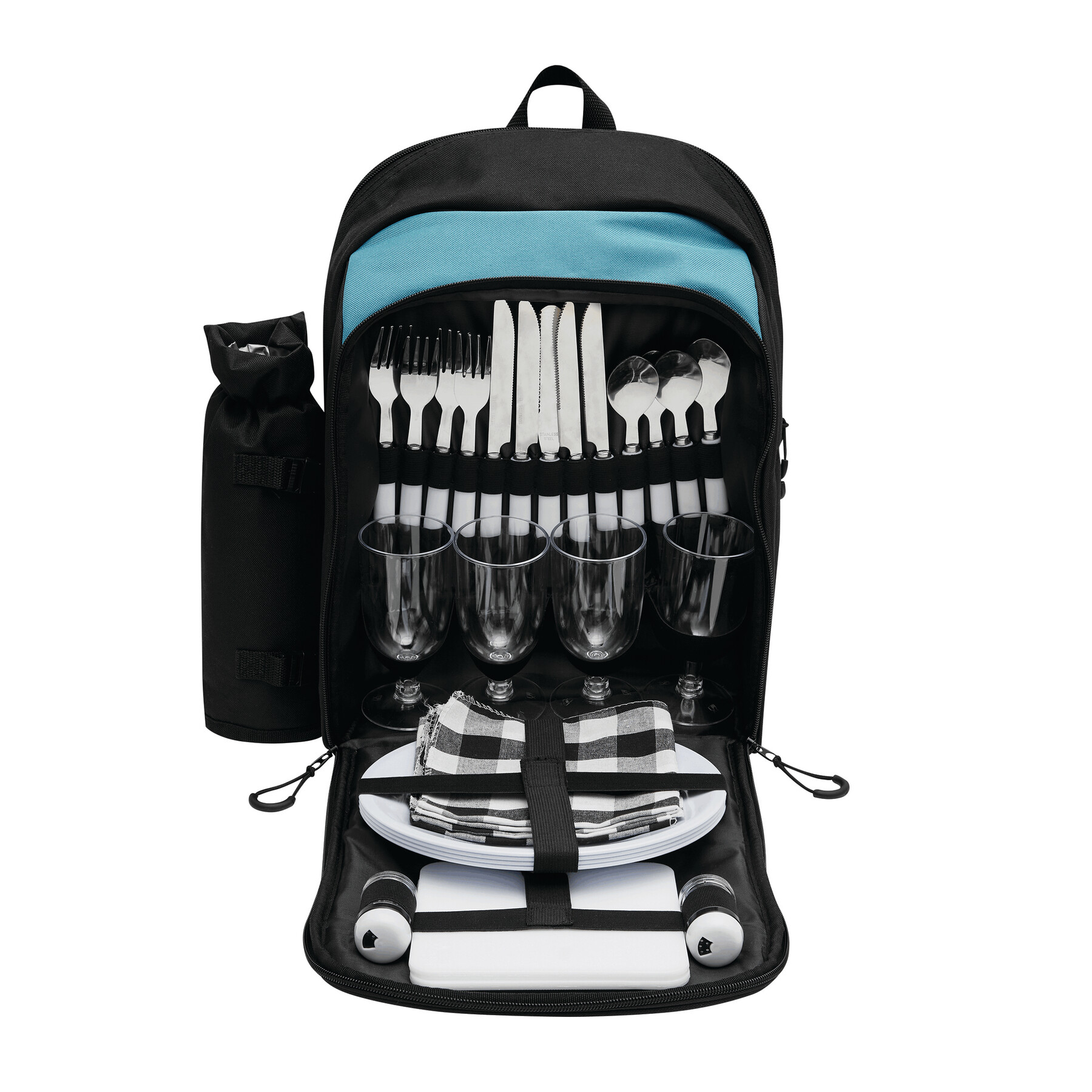 Picknick-Rucksack SMART TRIP für 4 Personen: isoliertes Reißverschluss-Kühlfach, Reißverschluss-Mittelfach inkl. Edelstahl-Besteck mit Kunststoffgriffen, Kunststoff-Weingläsern und -Tellern, Stoffservietten, Salz- und Pfefferstreuer, Reißverschluss-Vorfach, Trageschlaufe, gepolsterte Schultergurte, 1 abnehmbare isolierte Flaschenhalterung an der Seite