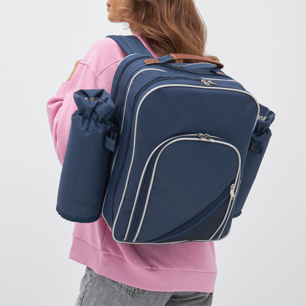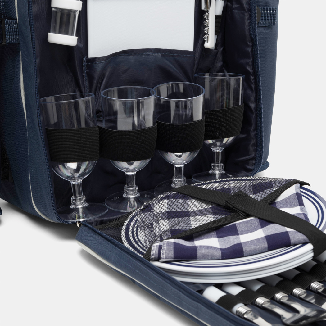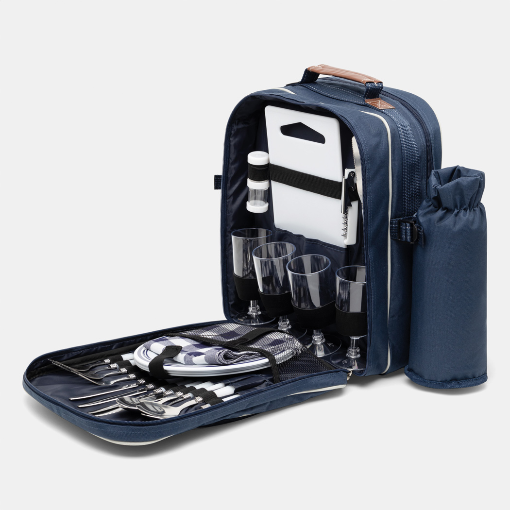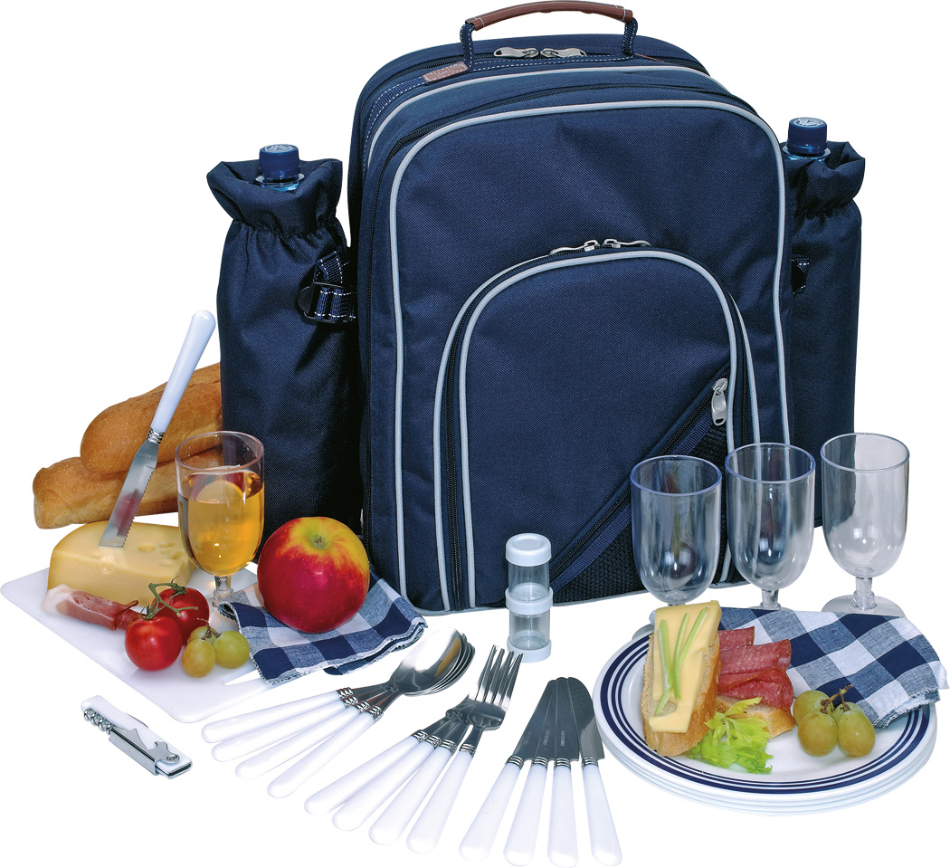 Picknick-Rucksack HYDE PARK für 4 Personen mit isoliertem Reißverschluss-Kühlfach: inkl. Besteck mit Kunststoffgriffen, Kunststoff-Weingläser und -Teller, Käsemesser, Kellnermesser, Stoffservietten, Salz- und Pfefferstreuer sowie Schneidebrett, 2 abnehmbare isolierte Flaschenhalterungen an den Seiten