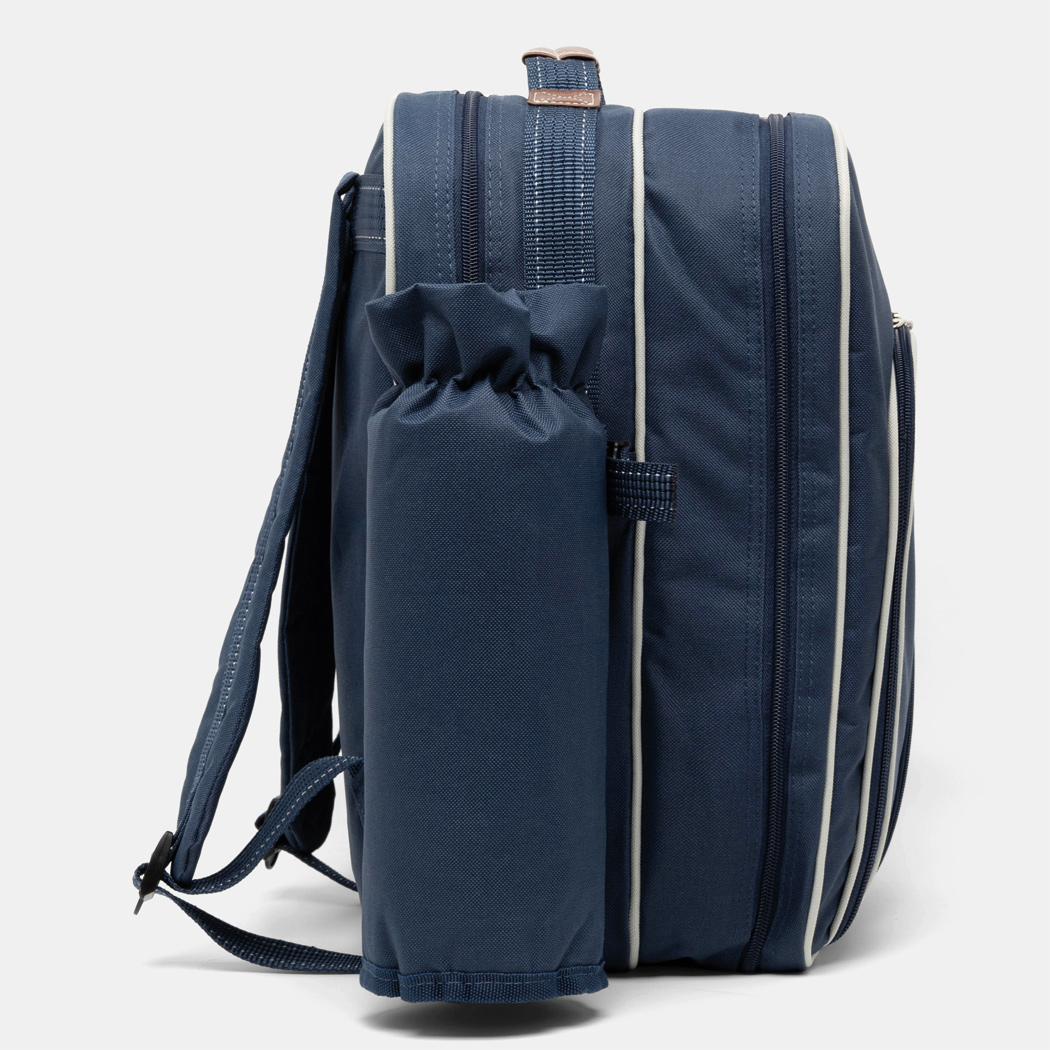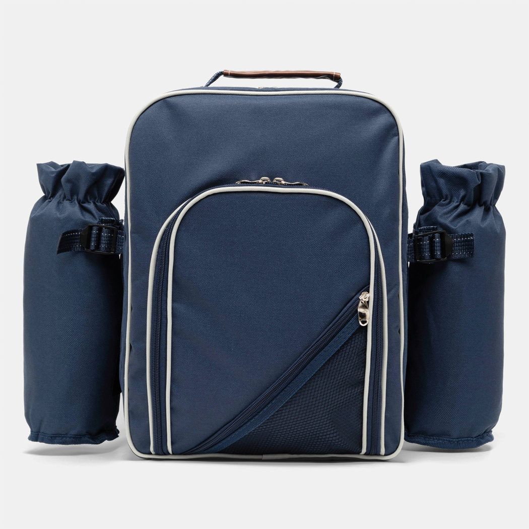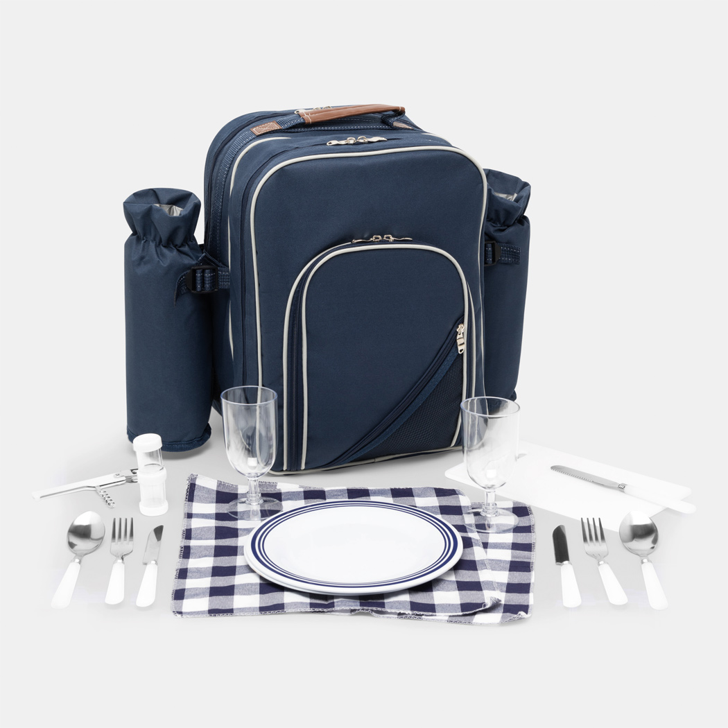 Picknick-Rucksack HYDE PARK für 4 Personen mit isoliertem Reißverschluss-Kühlfach: inkl. Besteck mit Kunststoffgriffen, Kunststoff-Weingläser und -Teller, Käsemesser, Kellnermesser, Stoffservietten, Salz- und Pfefferstreuer sowie Schneidebrett, 2 abnehmbare isolierte Flaschenhalterungen an den Seiten