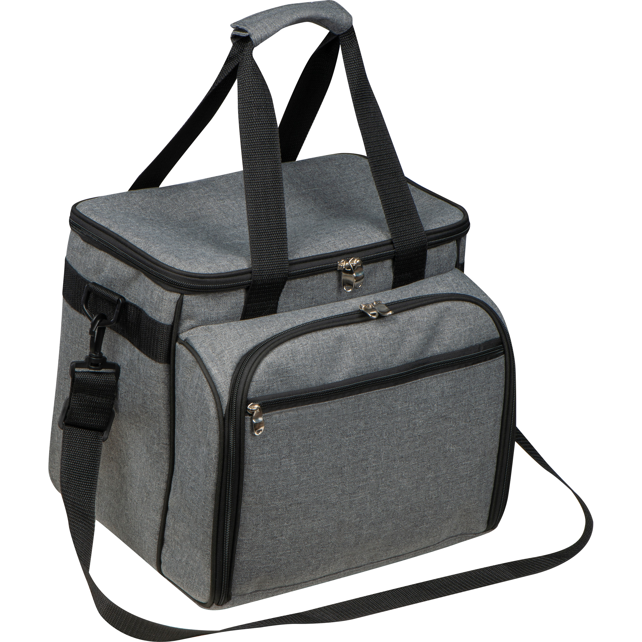 Picknicktasche für 4 Personen mit Tragegriff und Schultergurt. In der Picknicktasche gibt es ebenfalls ein Kühlfach, welches Ihre Speisen und Getränke auch an warmen Tag kühl hält. Teller und Besteck sind für 4 Personen vorrätig. Ihre Werbung bringen wir auf der Tasche an.