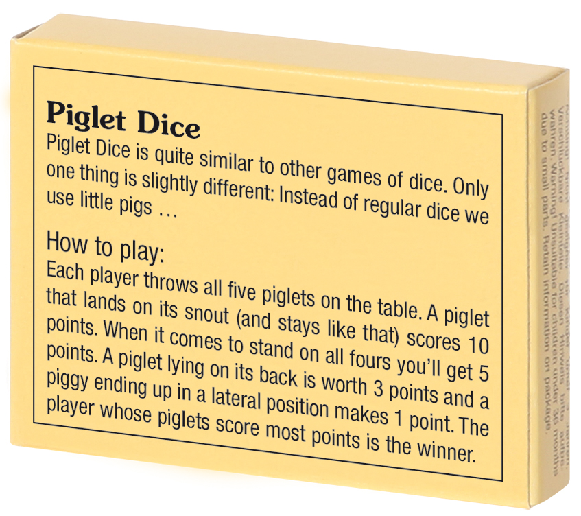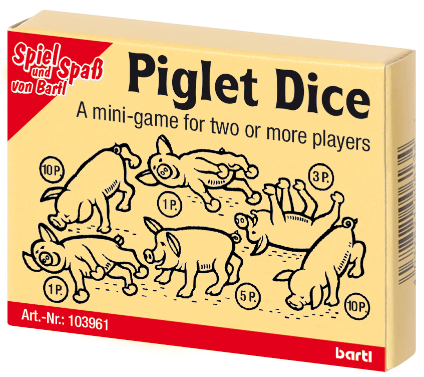 Es wird mit fünf Gummiferkeln gewürfelt. Dabei fallen die Schweine in verschiedene Positionen und erzielen so verschiedene Punkte. Wer mit seinem Wurf die höchste Punktzahl erreicht, gewinnt. Englische Version.