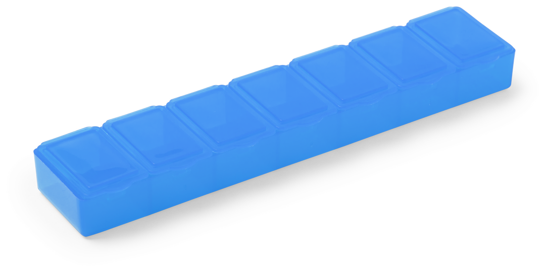 Pillendose aus robustem, halbtransparentem Material in lebendigen Farben mit einem Fach für jeden Wochentag. Mit 7 einzelnen Fächern mit Sicherheitsverschluss.