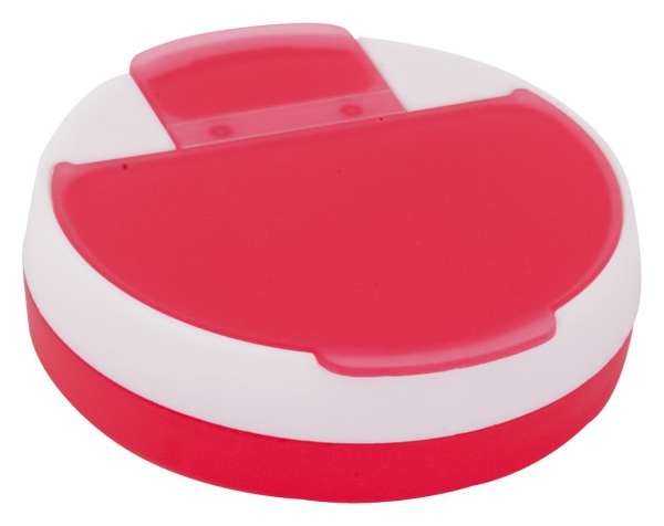 Runde Tablettendose mit 4 Fächern aus Kunststoff.