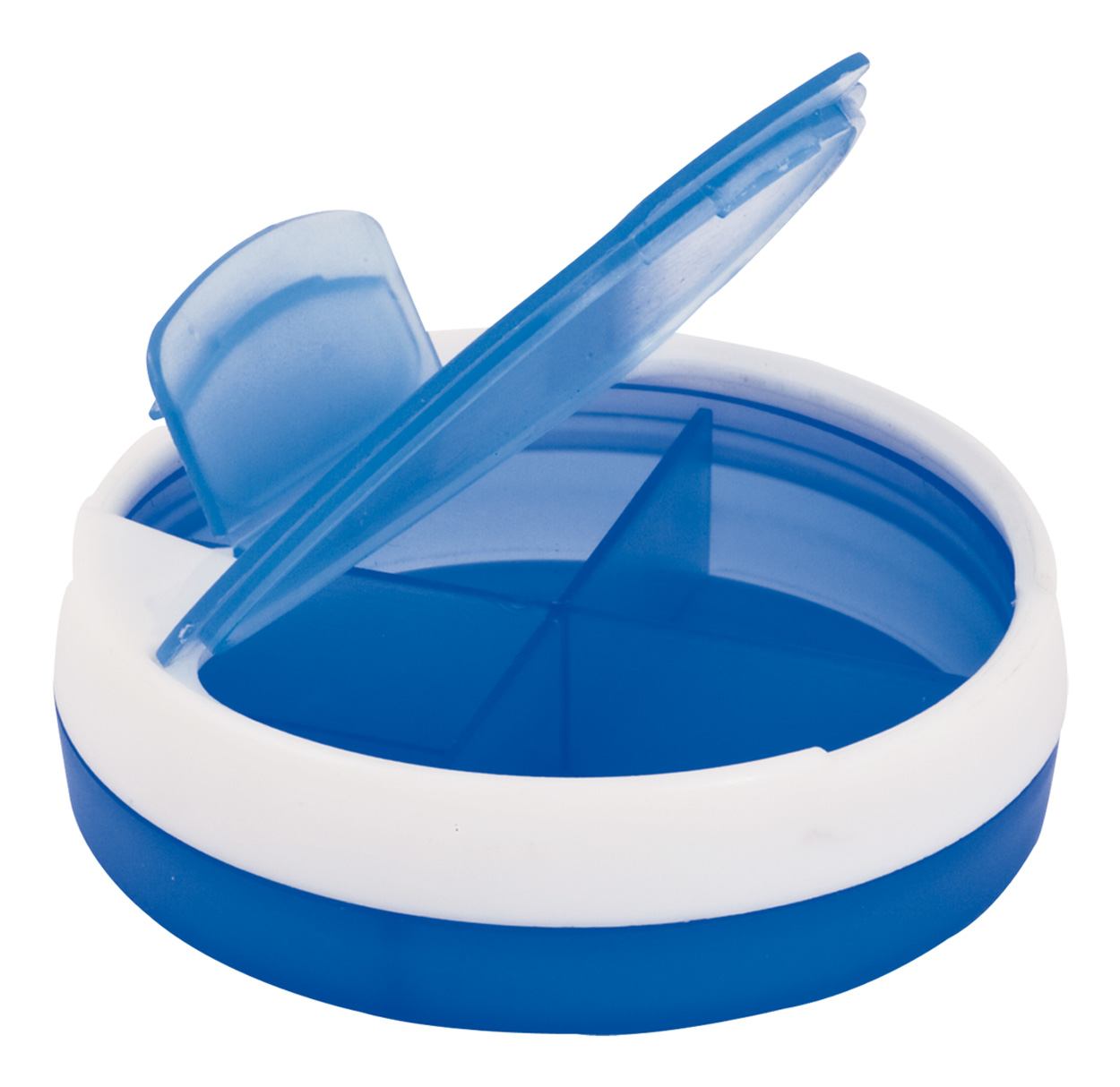Runde Tablettendose mit 4 Fächern aus Kunststoff.
