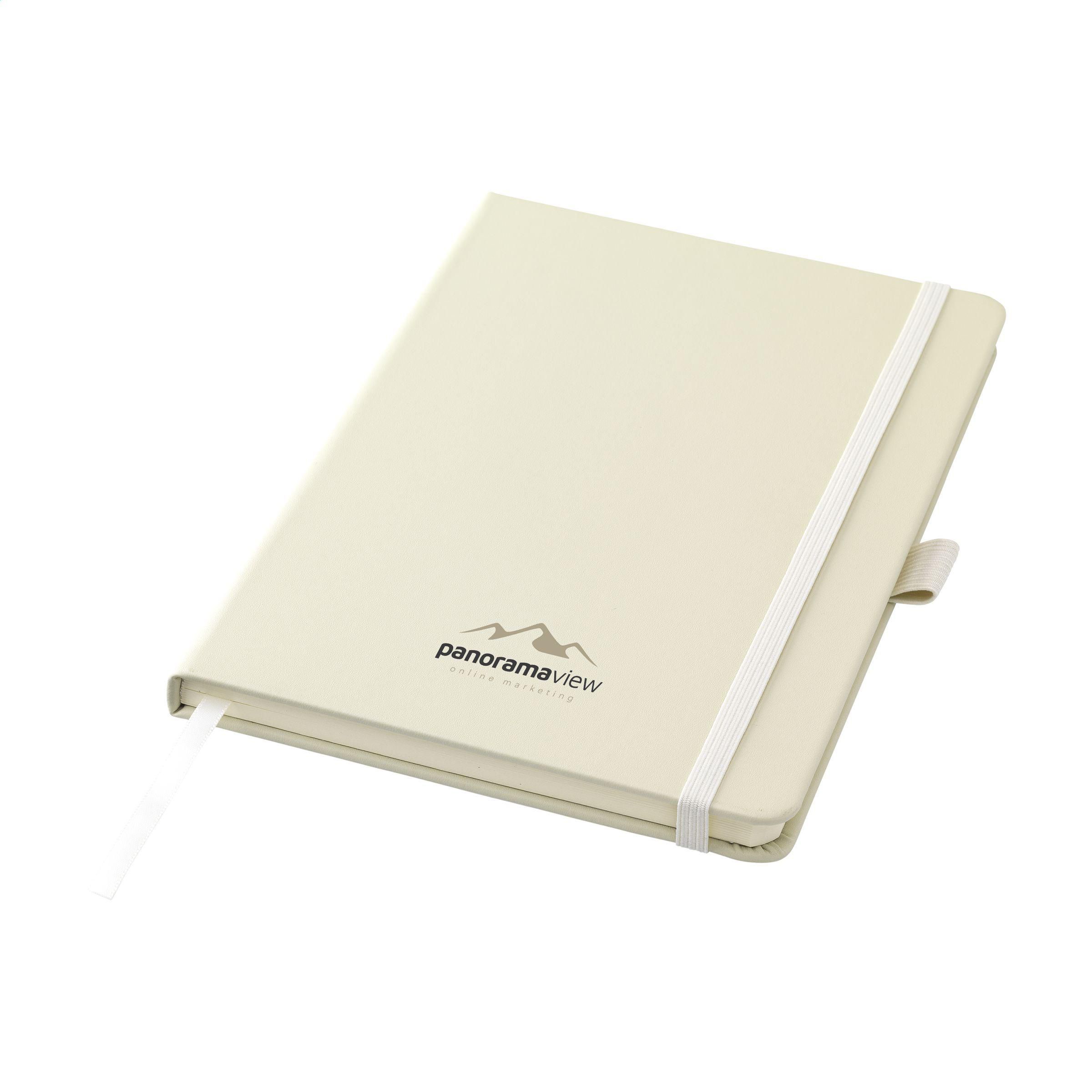 A5-Notizbuch mit Hardcover aus Ananas-Kunstleder. Dieses Material besteht zu 30% aus recycelten Ananas-Bestandteilen. Dieses Notizbuch mit gebundenem Buchrücken umfasst ca. 80 Blatt/160 Seiten weißes, liniertes, FSC Mix zertifiziertes Papier (80 g/m²) und ist mit einem Verschlussgummi, einer Stiftschlaufe und einem Lesebändchen ausgestattet. Das vegane Kunstleder ist von echtem Leder kaum zu unterscheiden. Allerdings besteht das Material aus Ananasblättern, einem Restprodukt aus dem Ananasanbau. Aus diesem Grund werden für die Herstellung keine zusätzlichen Stoffe wie Wasser, Dünger oder Pestizide benötigt. Die Fasern der Ananasblätter werden gewaschen, mit PU angereichert und im Ofen getrocknet. Das Ergebnis? Geschmeidige Laken aus veganem Kunstleder, die anschließend mit einem schönen Finish versehen werden. Nach dem Trocknen entsteht ein weiches und attraktives Material mit den Eigenschaften von Leder. Es besteht teilweise aus Fruchtresten und teilweise aus PU.