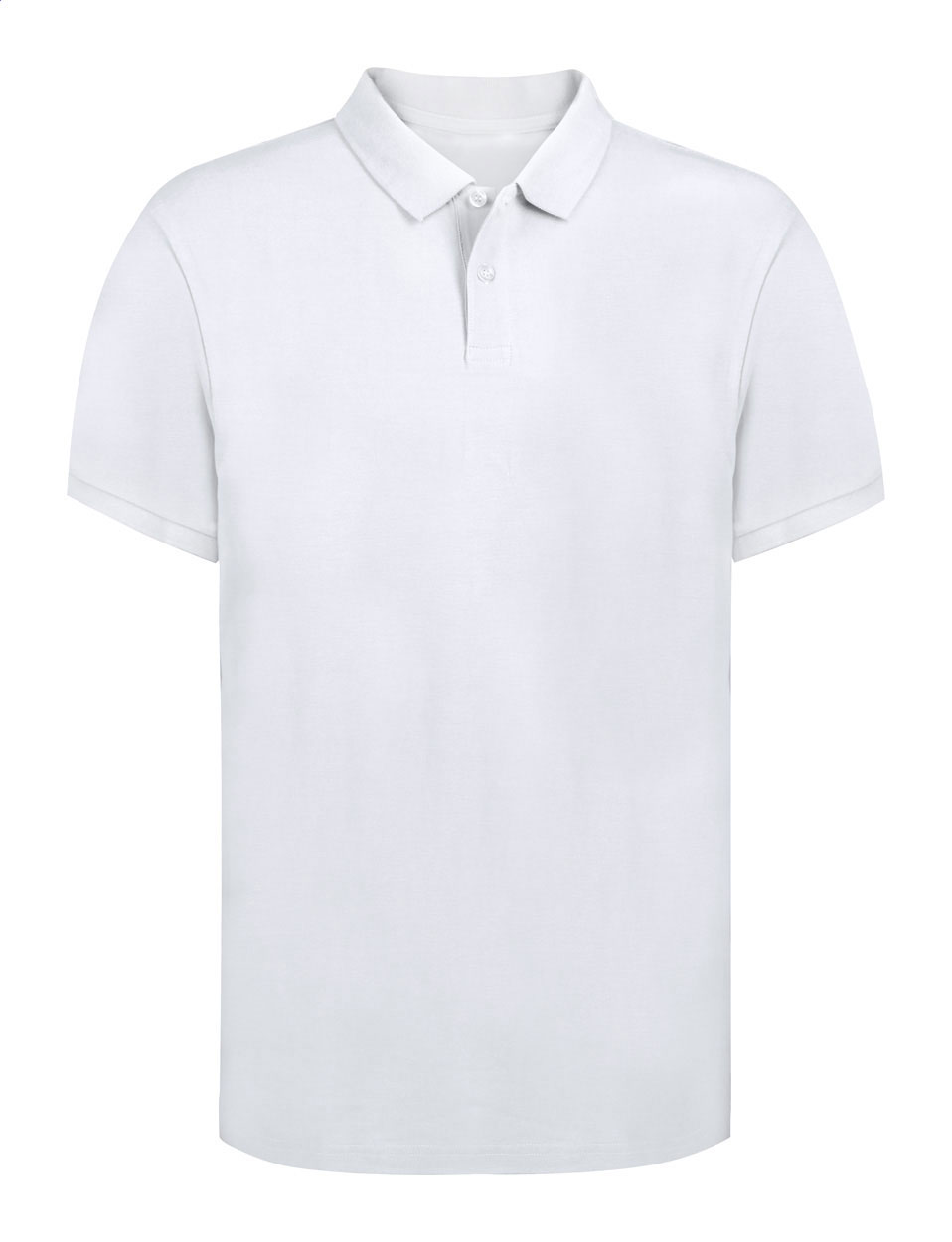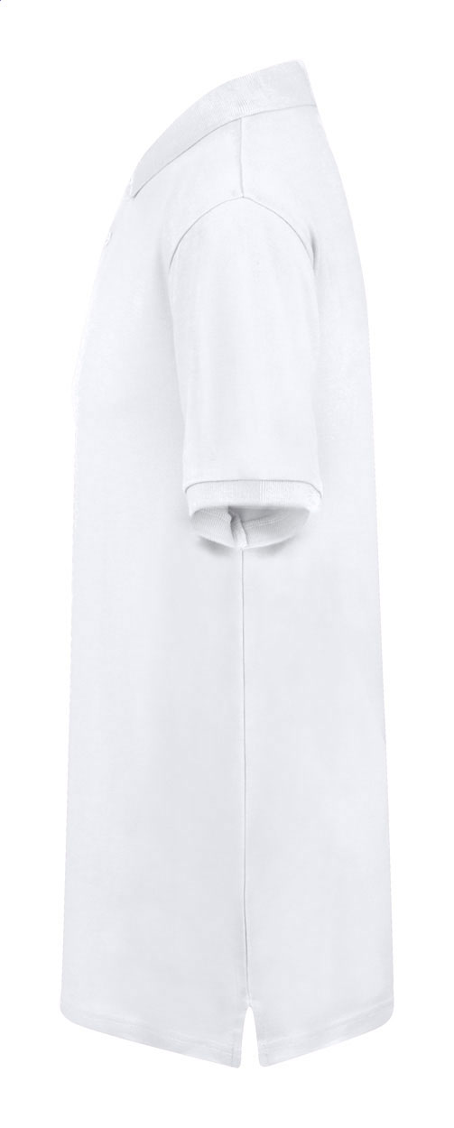 Weißes Piqué-Poloshirt mit zwei farblich abgestimmten Knöpfen am Kragen. Material: 100 % ringgesponnene Baumwolle, 220 g / m².