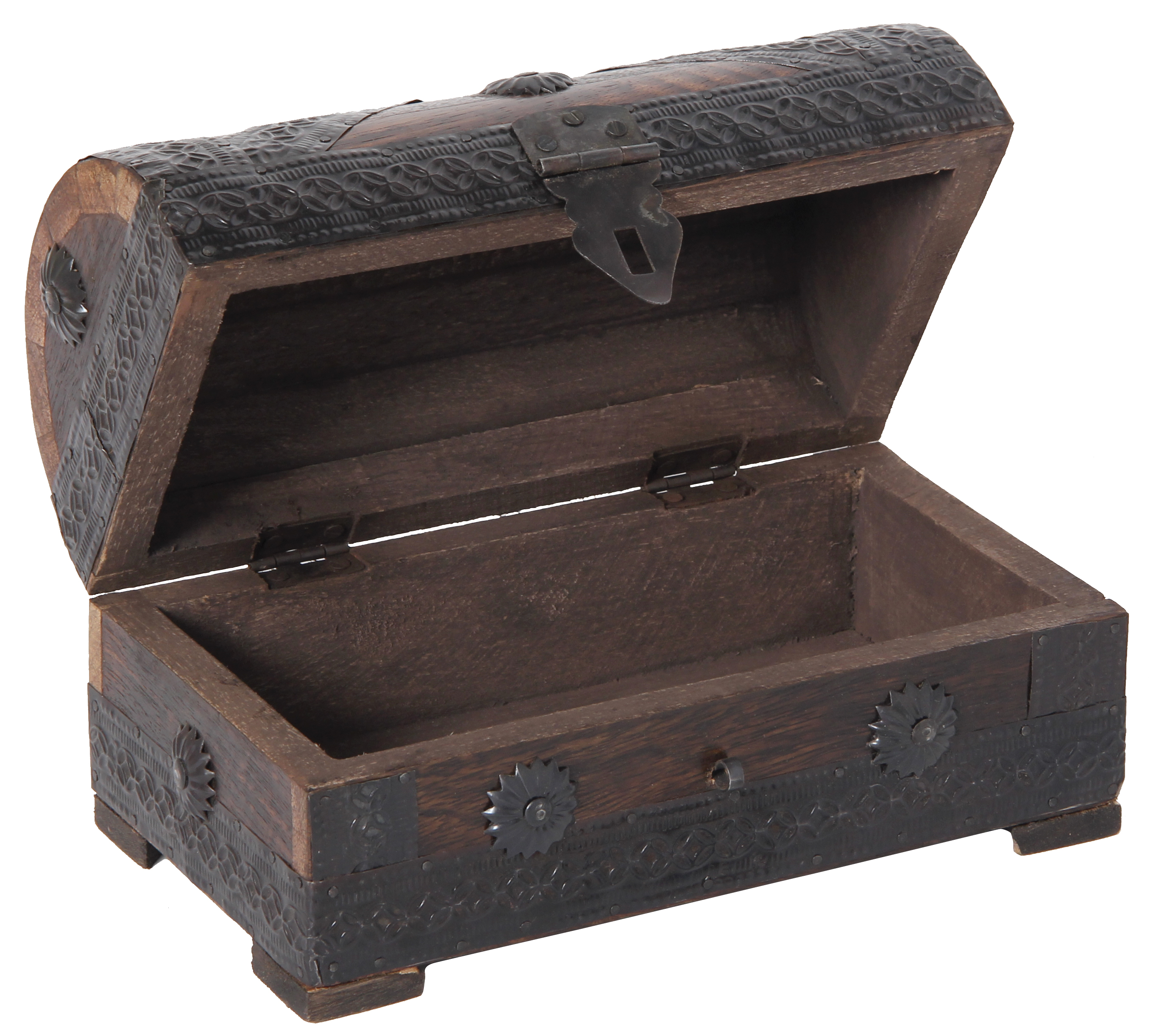 Rustikale Massivholz-Truhe mit nostalgischen Metallbeschlägen. Darin kann man z. B. den Schmuck vom letzten Beutezug oder seine Dukaten verwahren.