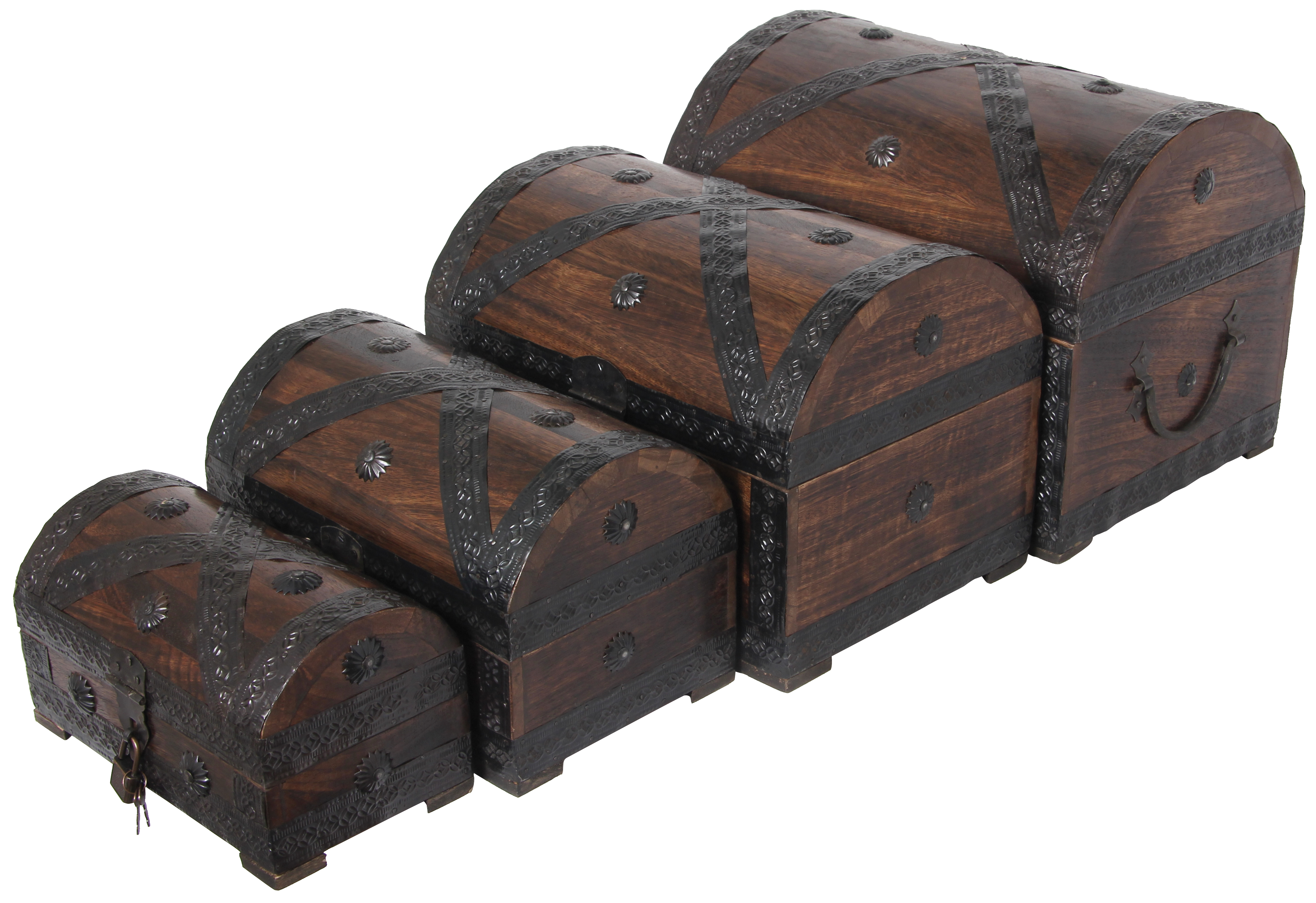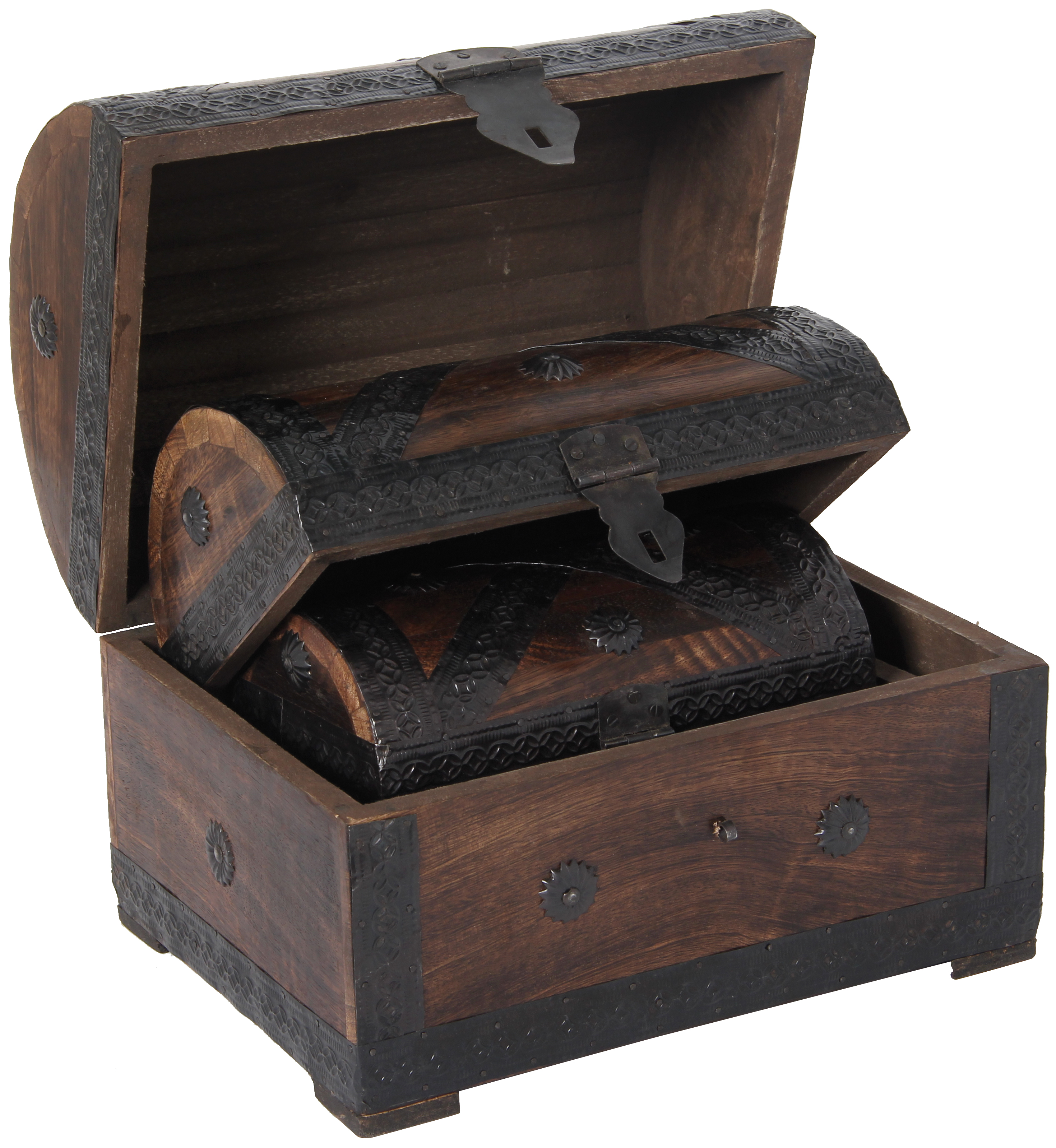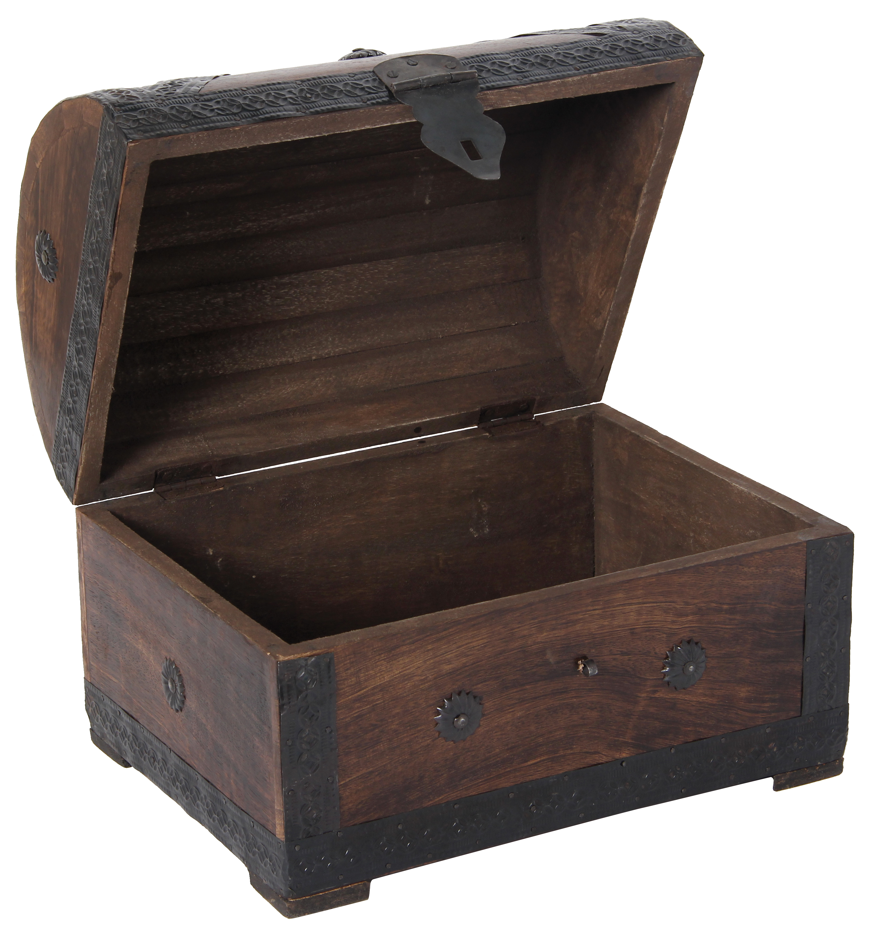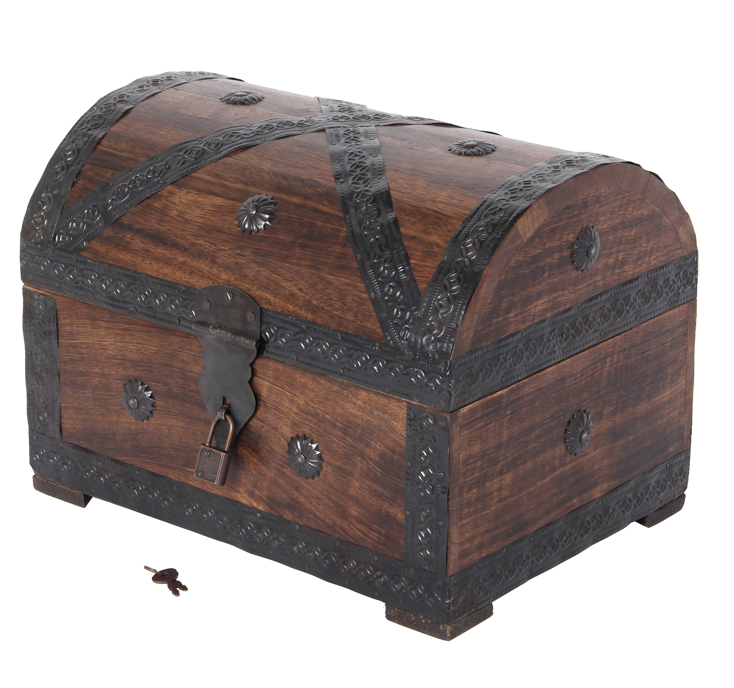 Rustikale Truhe aus Mangoholz mit kleinem Vorhängeschloss aus Metall mit zwei Schlüsseln.