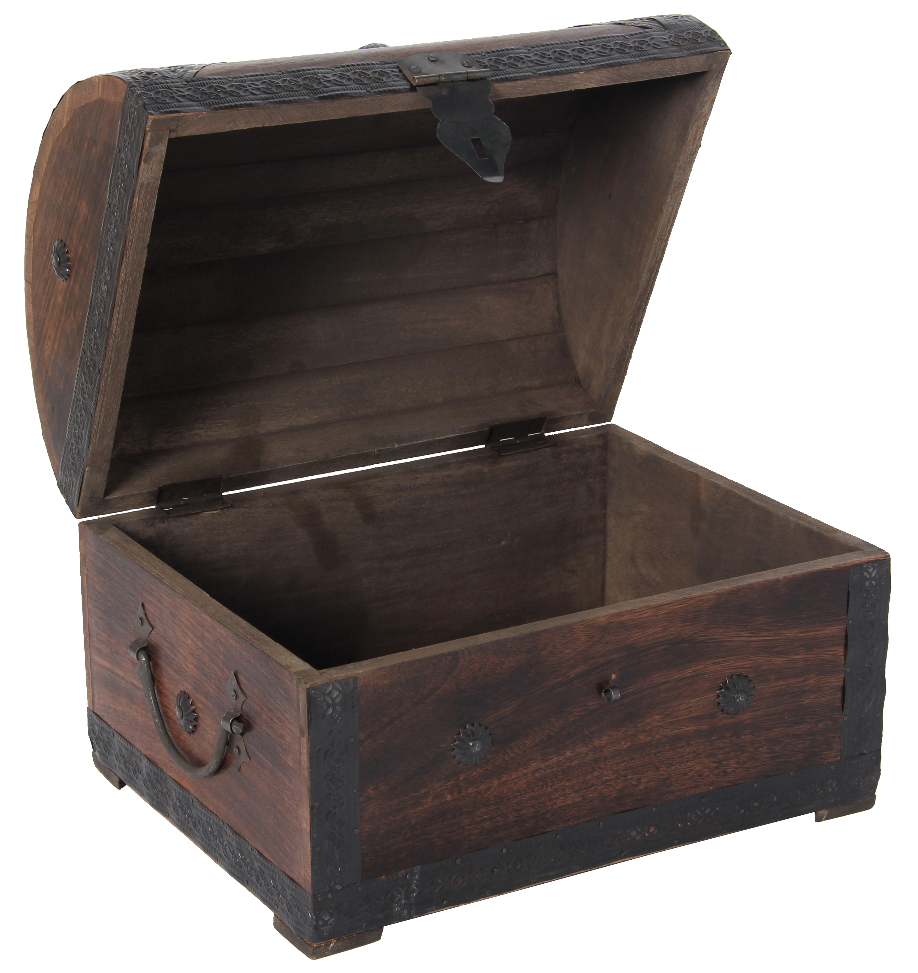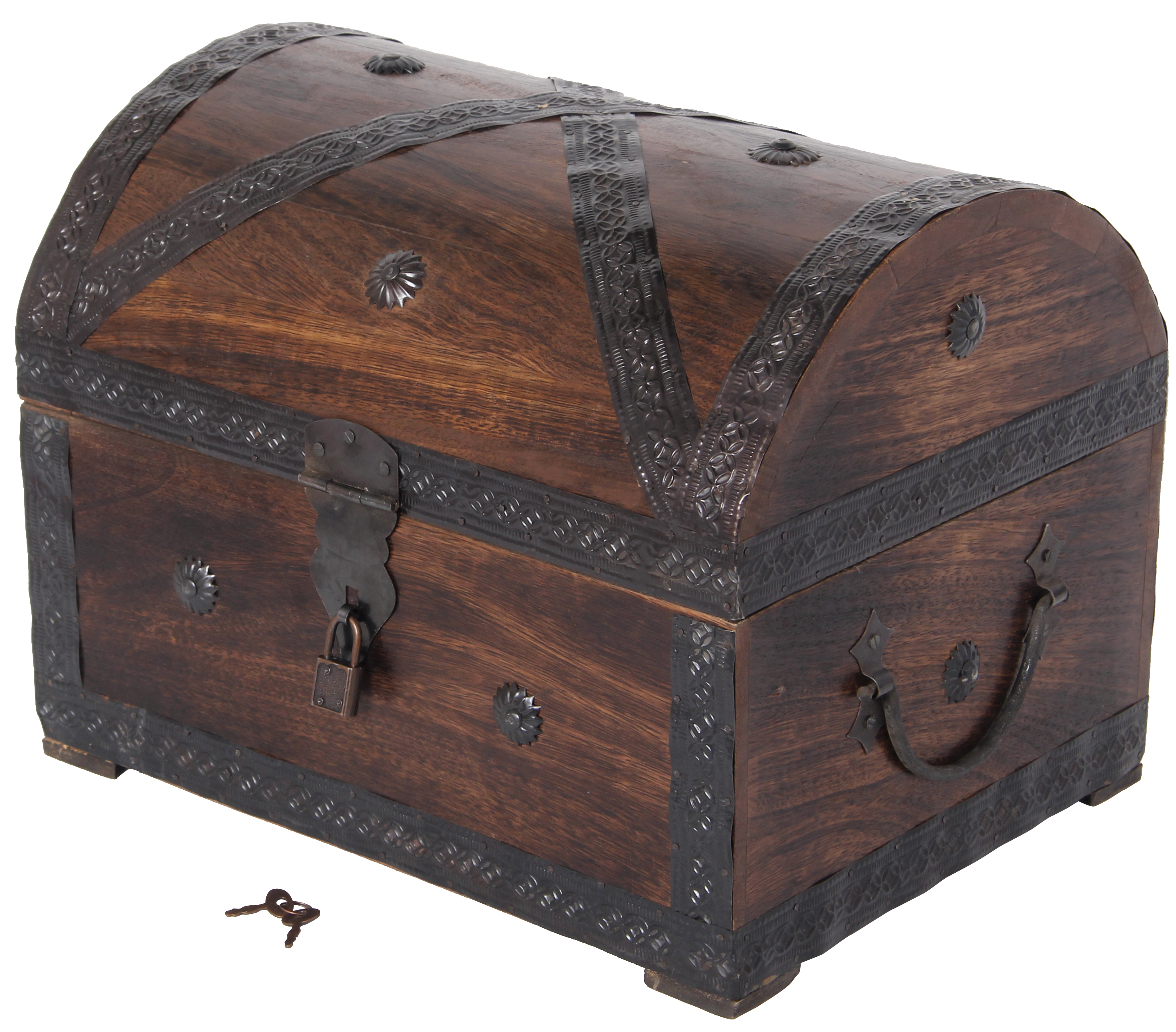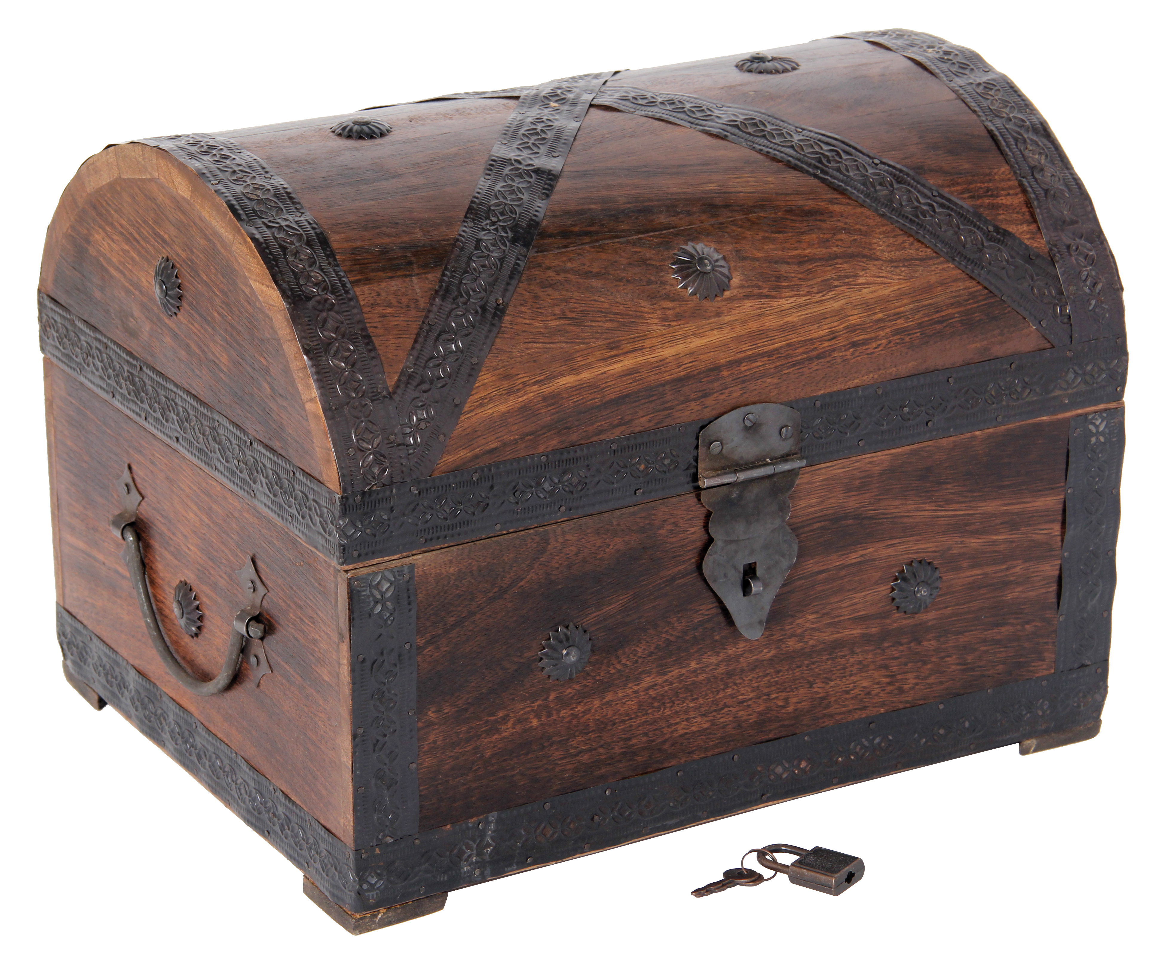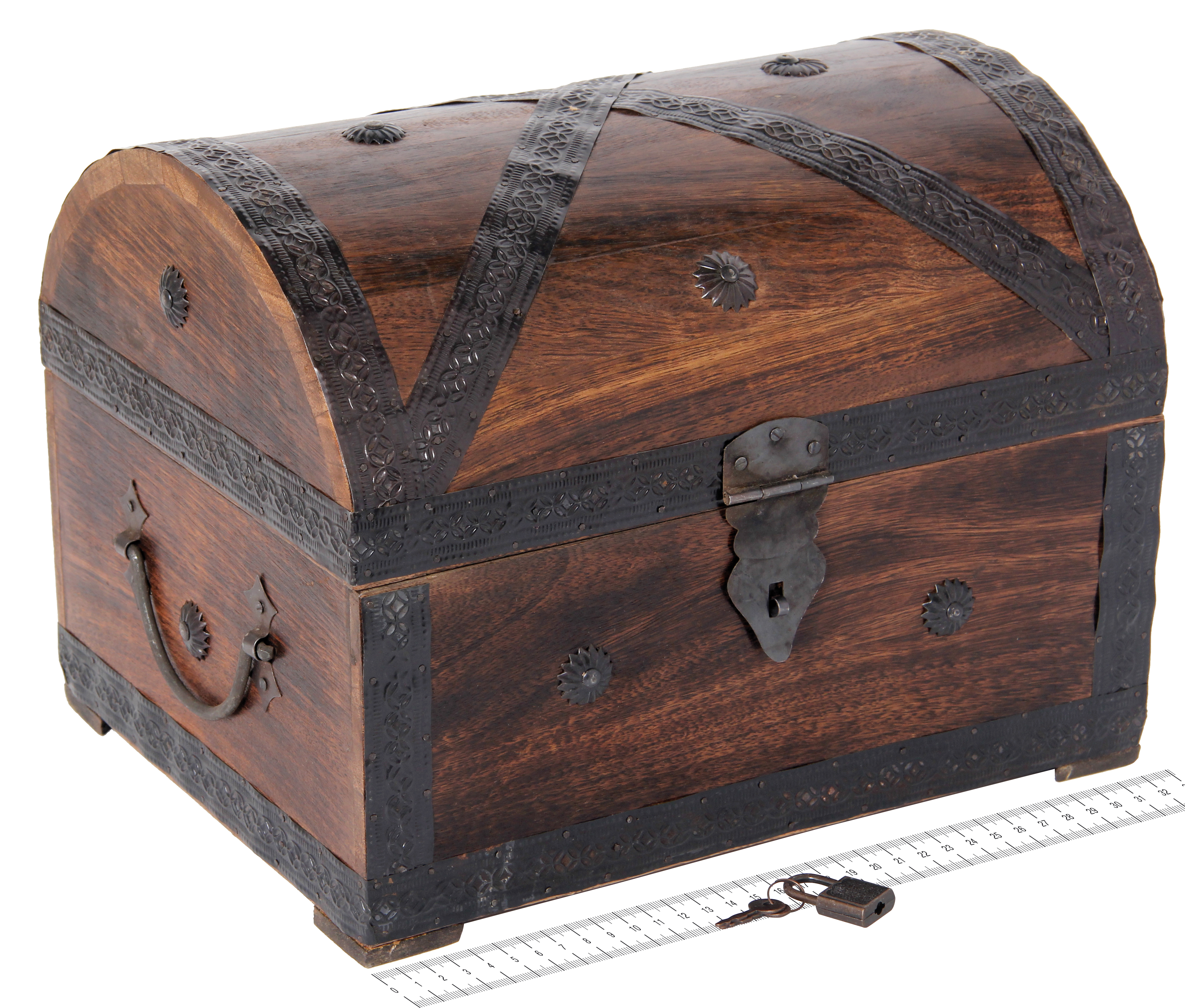 Rustikale Truhe aus Mangoholz mit kleinem Vorhängeschloss aus Metall mit zwei Schlüsseln.