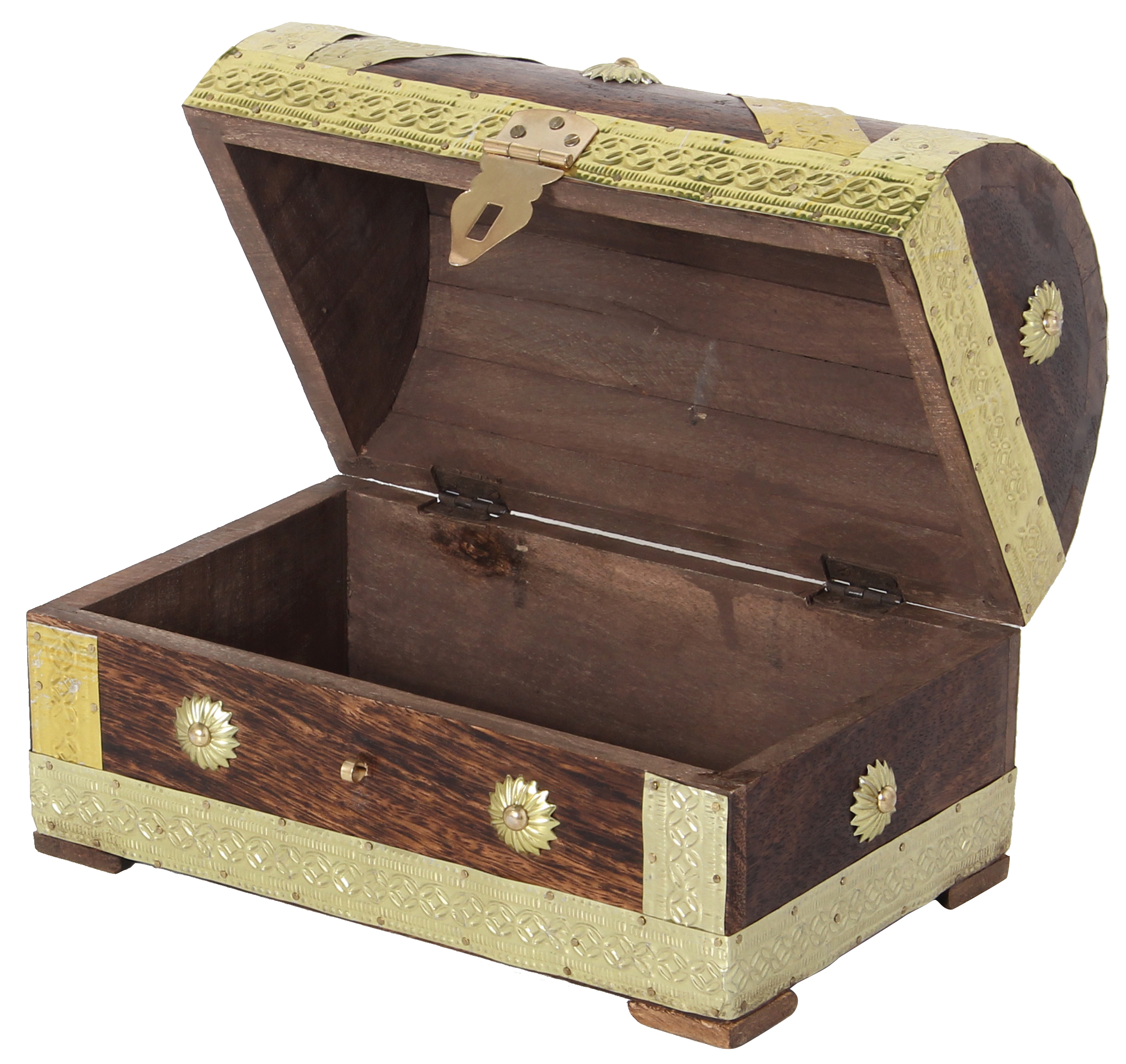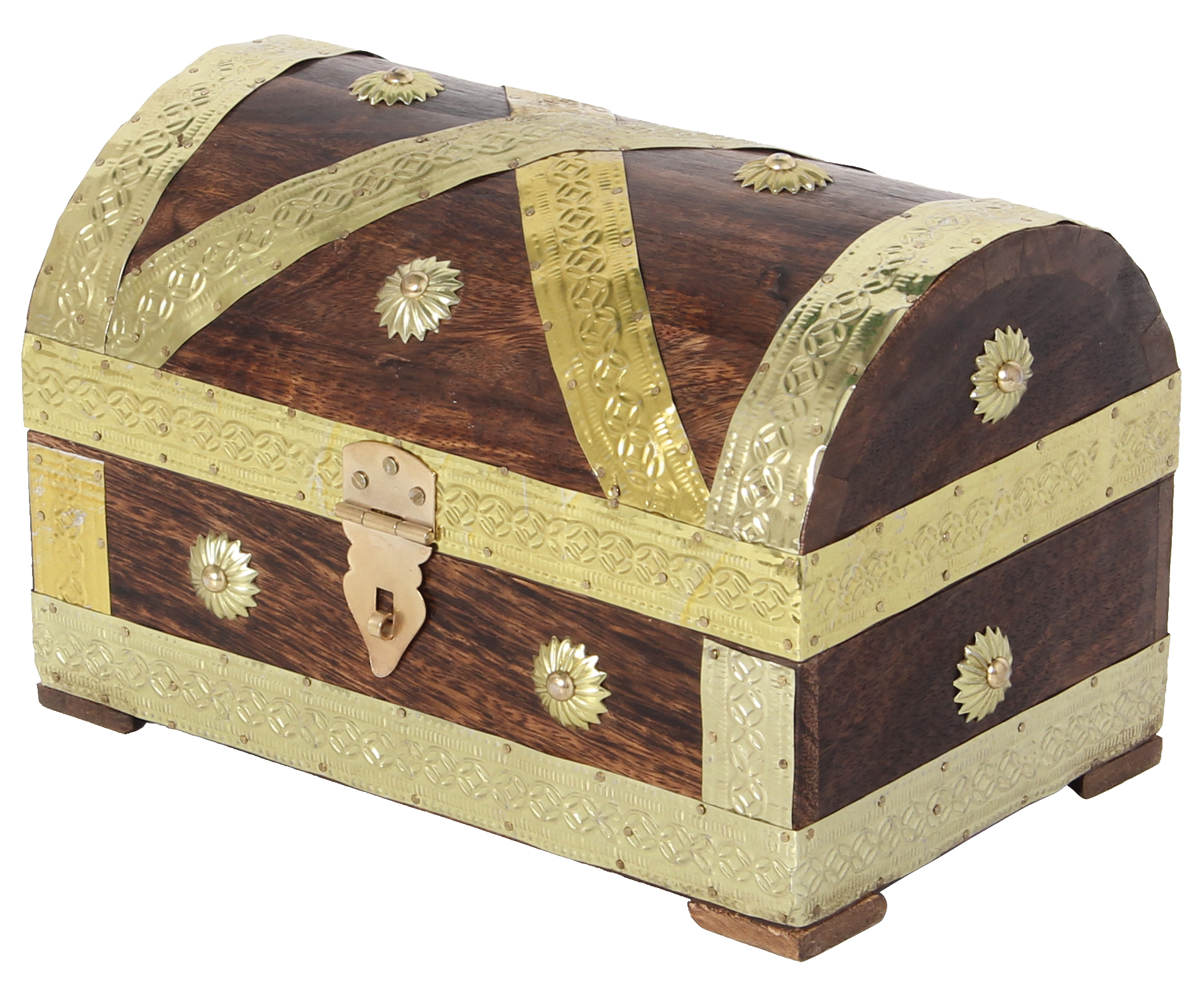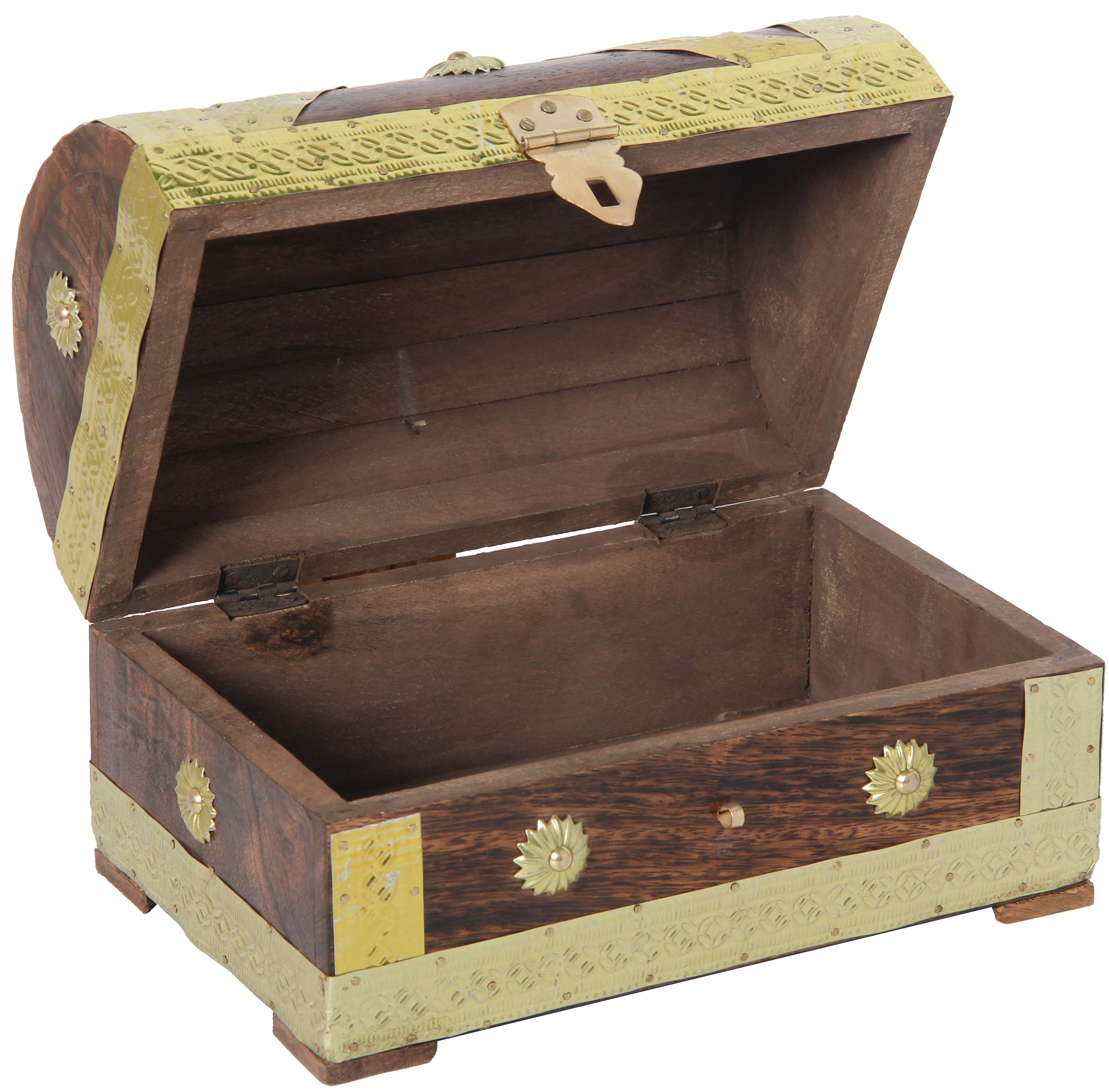 Nostalgische Truhe aus Holz mit Metallbeschlägen. Durch die reine Handarbeit sind leichte Farb- und Größenabweichungen möglich.