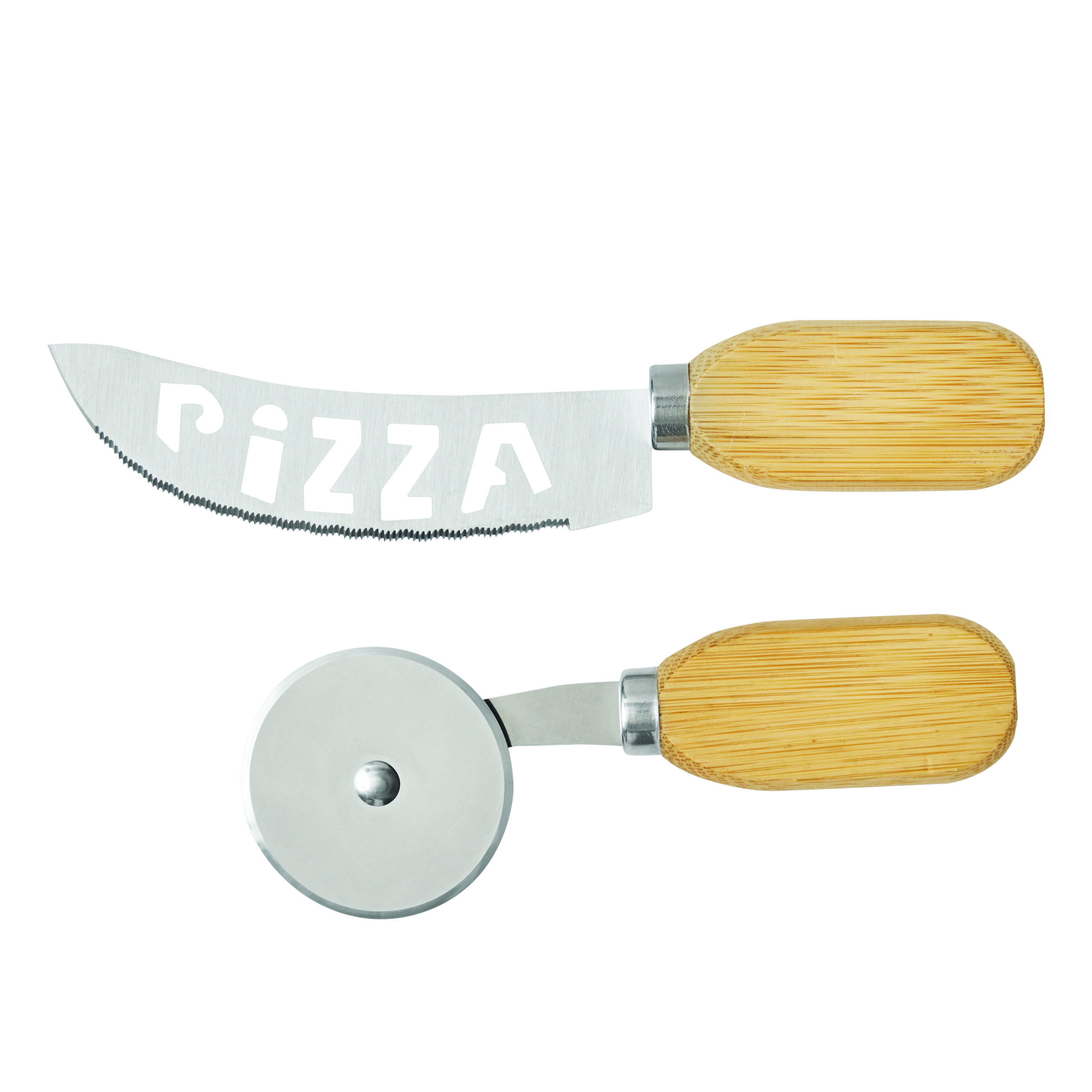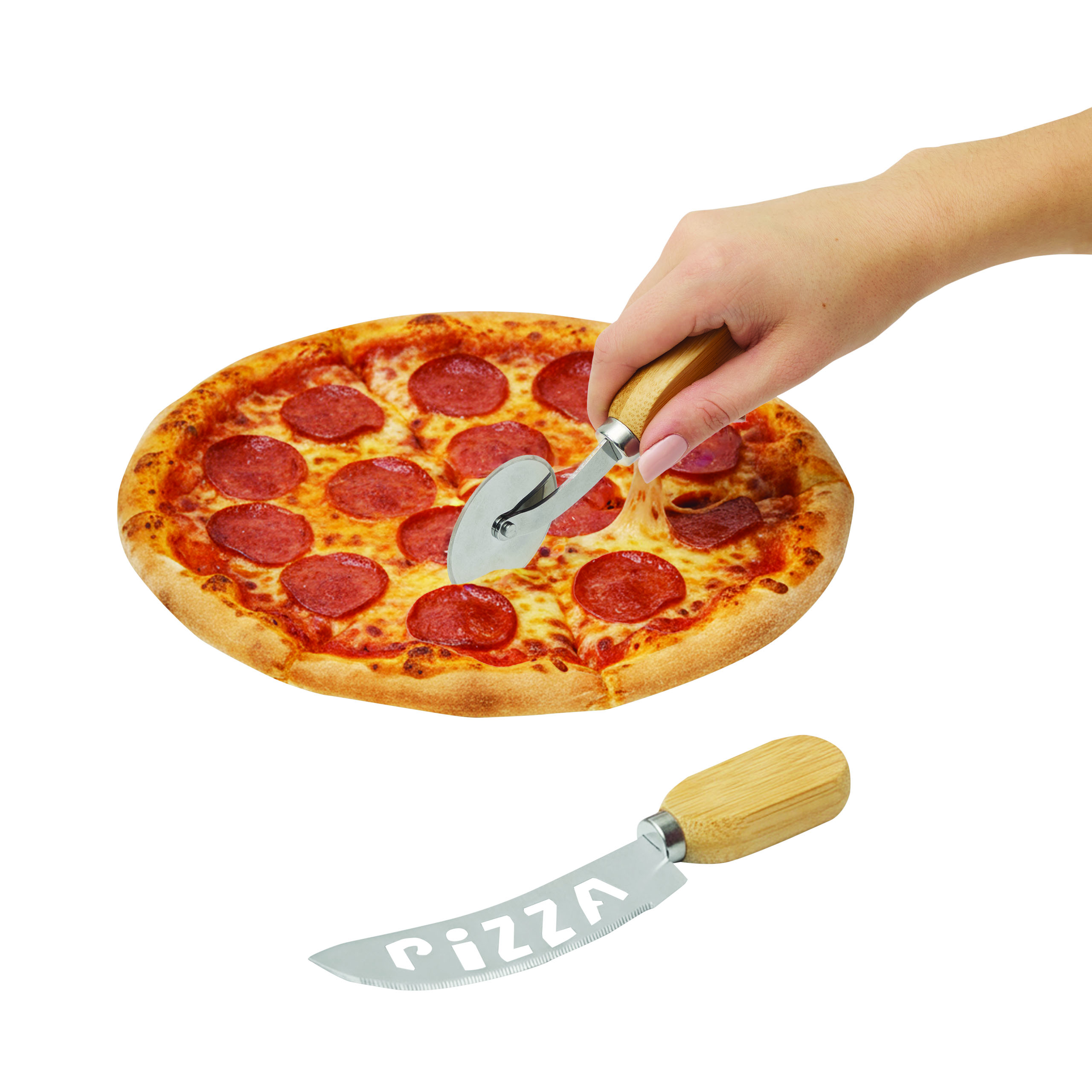 Pizza-Schneide-Set DUOSLICE, 2-teilig: bestehend aus Pizzaroller und Pizzamesser aus Edelstahl mit Bambusgriffen, in Box