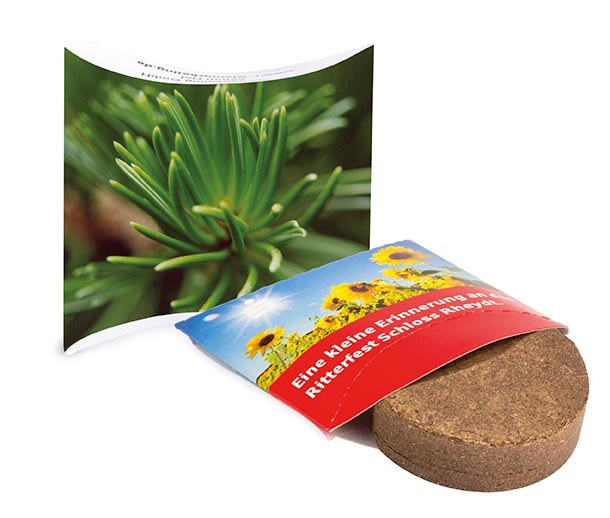 Kompakte Werbeidee mit einfacher Handhabung: der Substrattablette liegen die Samen bei. Substrattablette in ein Gefäß geben, Samen drüber und gießen, schon wächst nach einigen Tagen ein Sprössling. Die Werbe-Box ist komplett individuell gestaltbar.