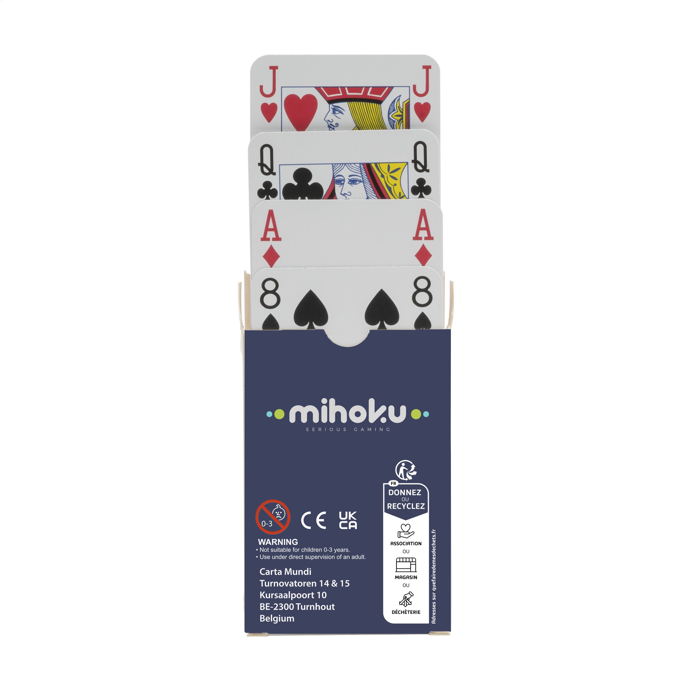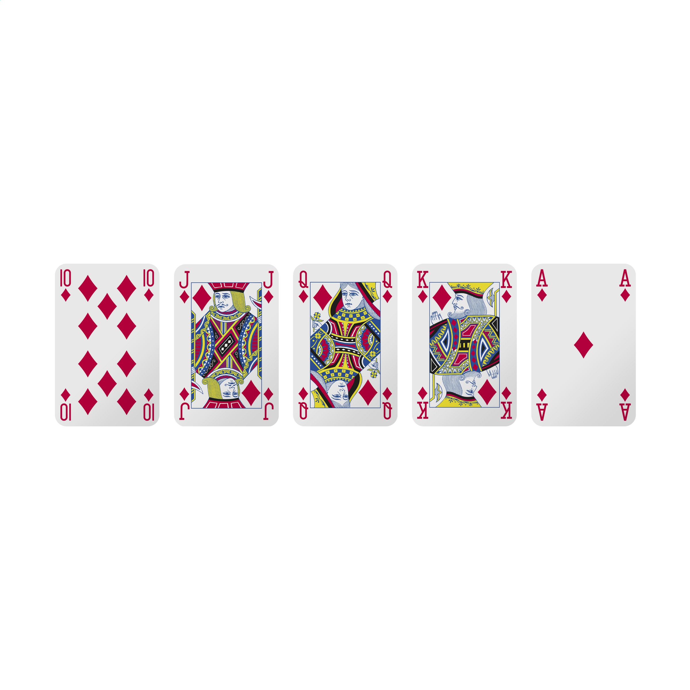 Spielkarten aus stabilem 300-Gramm-Karton. Ein Deck besteht aus 52 Spielkarten und 2 Jokern. Verpackt in einer Box aus Karton und Zellophan. Mit Vollfarbdruck im eigenen Design auf der Rückseite der Karten und auf der Box. So schaffen Sie ein einzigartiges, personalisiertes Kartenspiel, das bei jeder Spielrunde sichtbar ist.