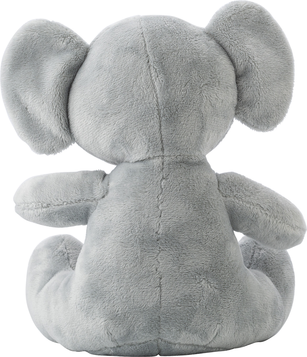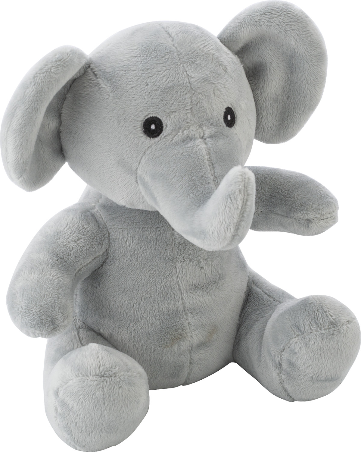 Plüschelefant mit gestickten Augen, Nase und Mund. Inklusive Anhänger zum bedrucken. Kombiniert mit Artikel 5013.