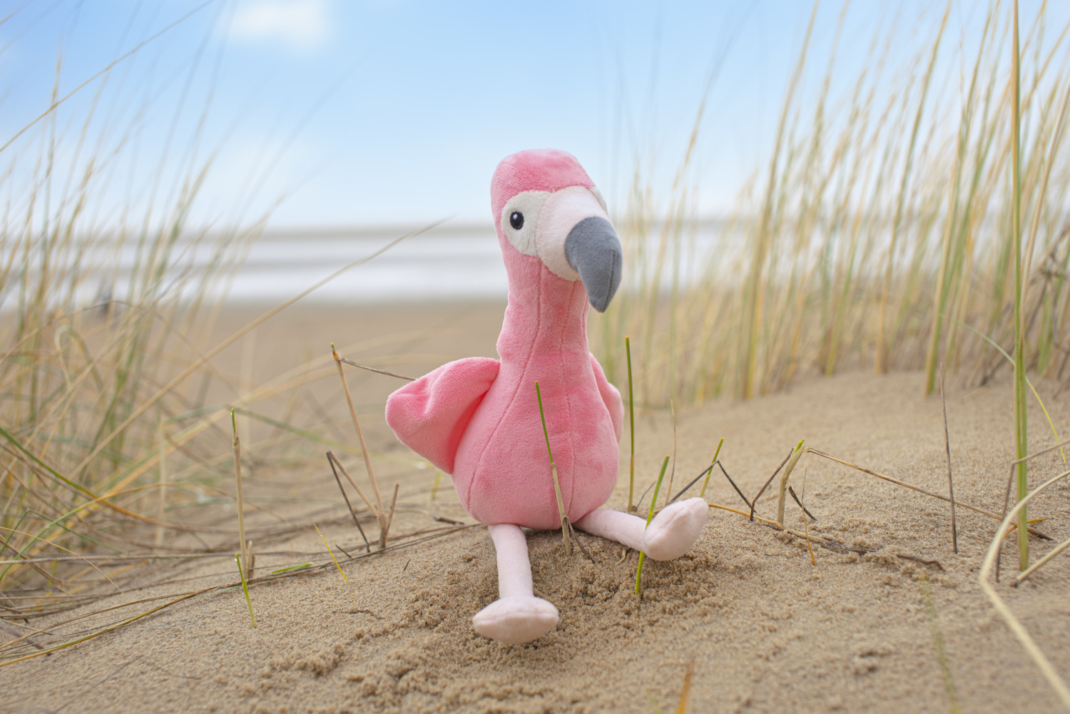 Plüschflamingo mit gestickten Augen. Inklusive Hangtag zum Bedrucken.