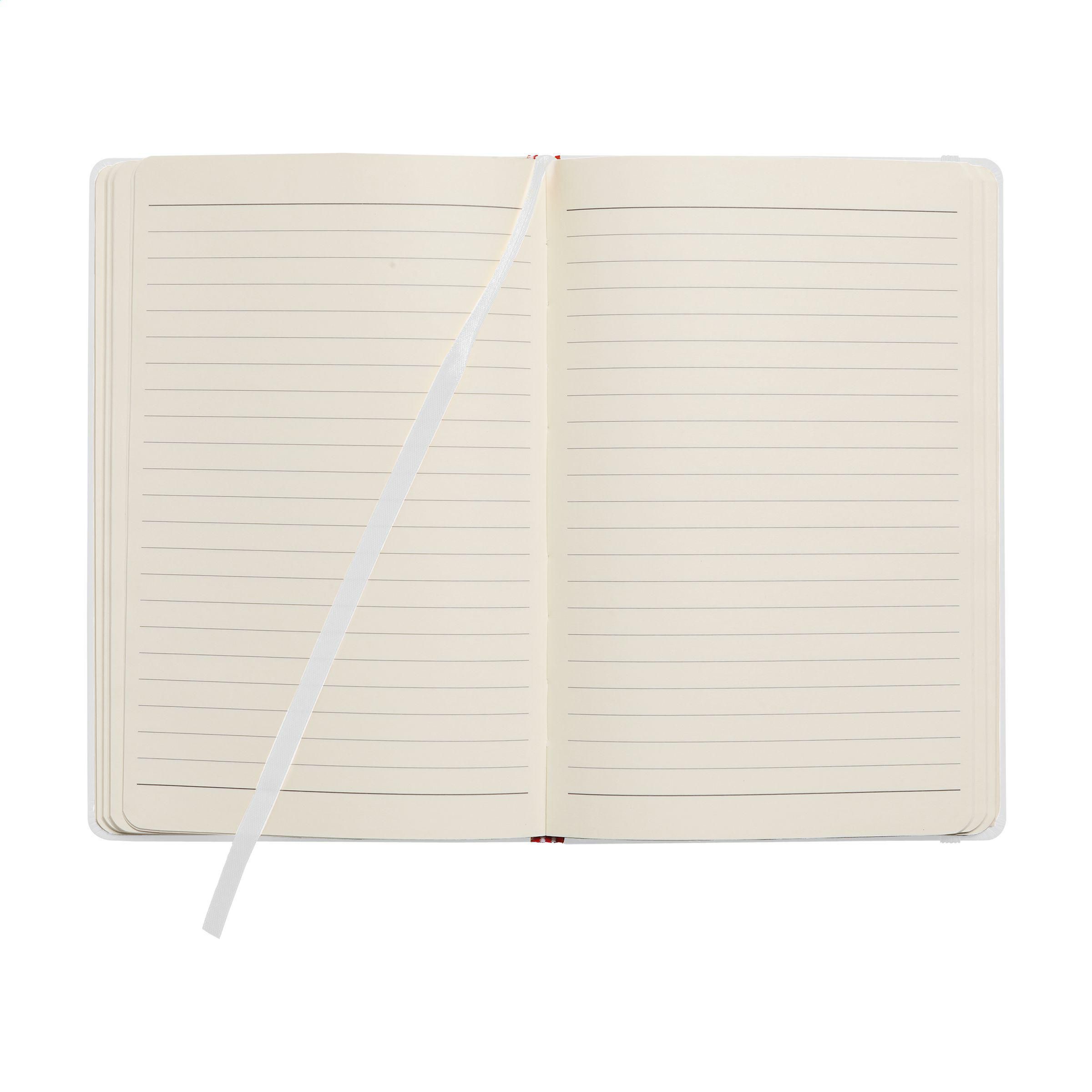 Notizbuch im A5-Format mit ca. 96 Blatt/192 Seiten crèmefarbenem, liniertem FSC Mix zertifiziertes Papier (80 g/m²). Mit gebundenem Rücken und hartem Umschlag, Verschlussgummi und seidener Leselitze.