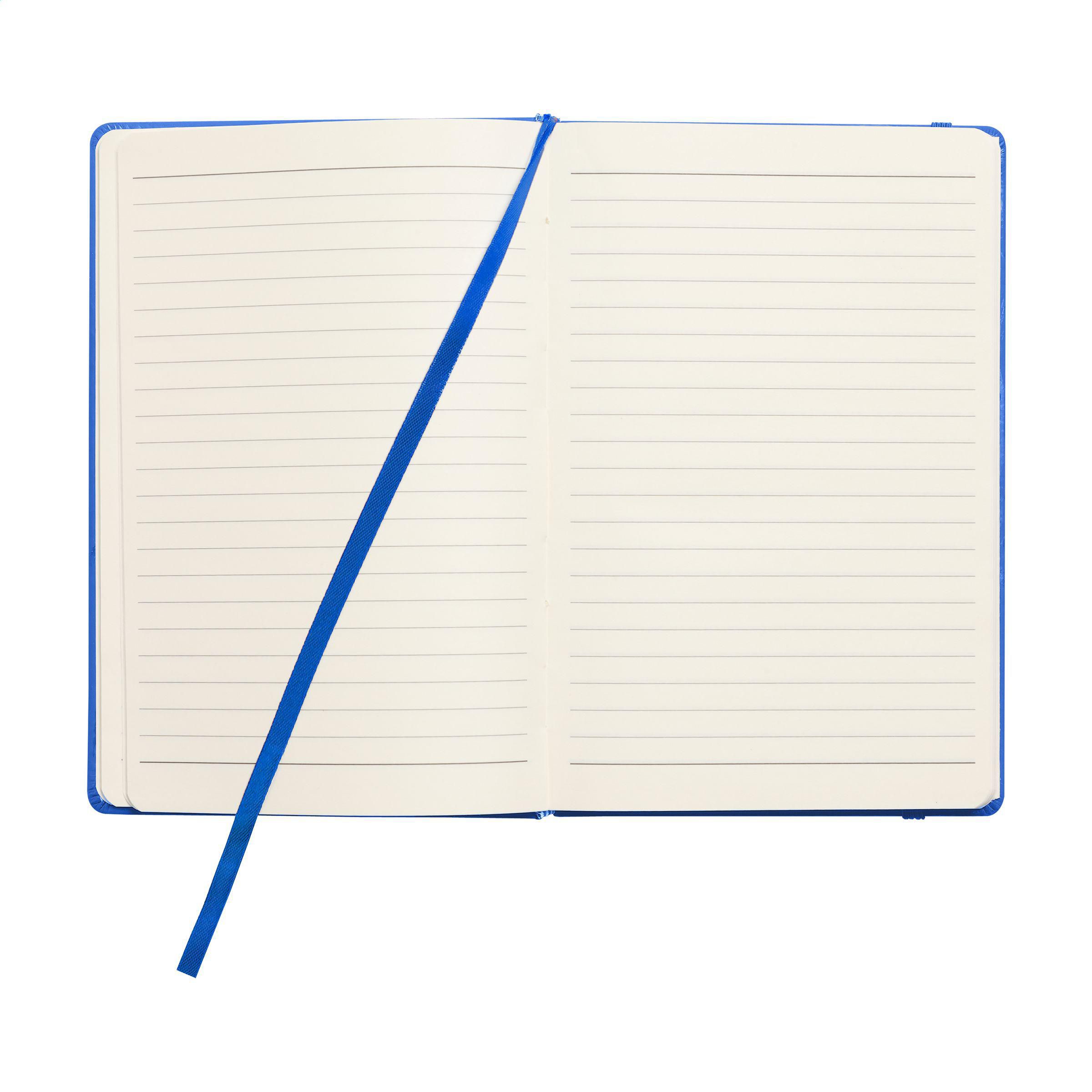 Notizbuch im A5-Format mit ca. 96 Blatt/192 Seiten crèmefarbenem, liniertem FSC Mix zertifiziertes Papier (80 g/m²). Mit gebundenem Rücken und hartem Umschlag, Verschlussgummi und seidener Leselitze.