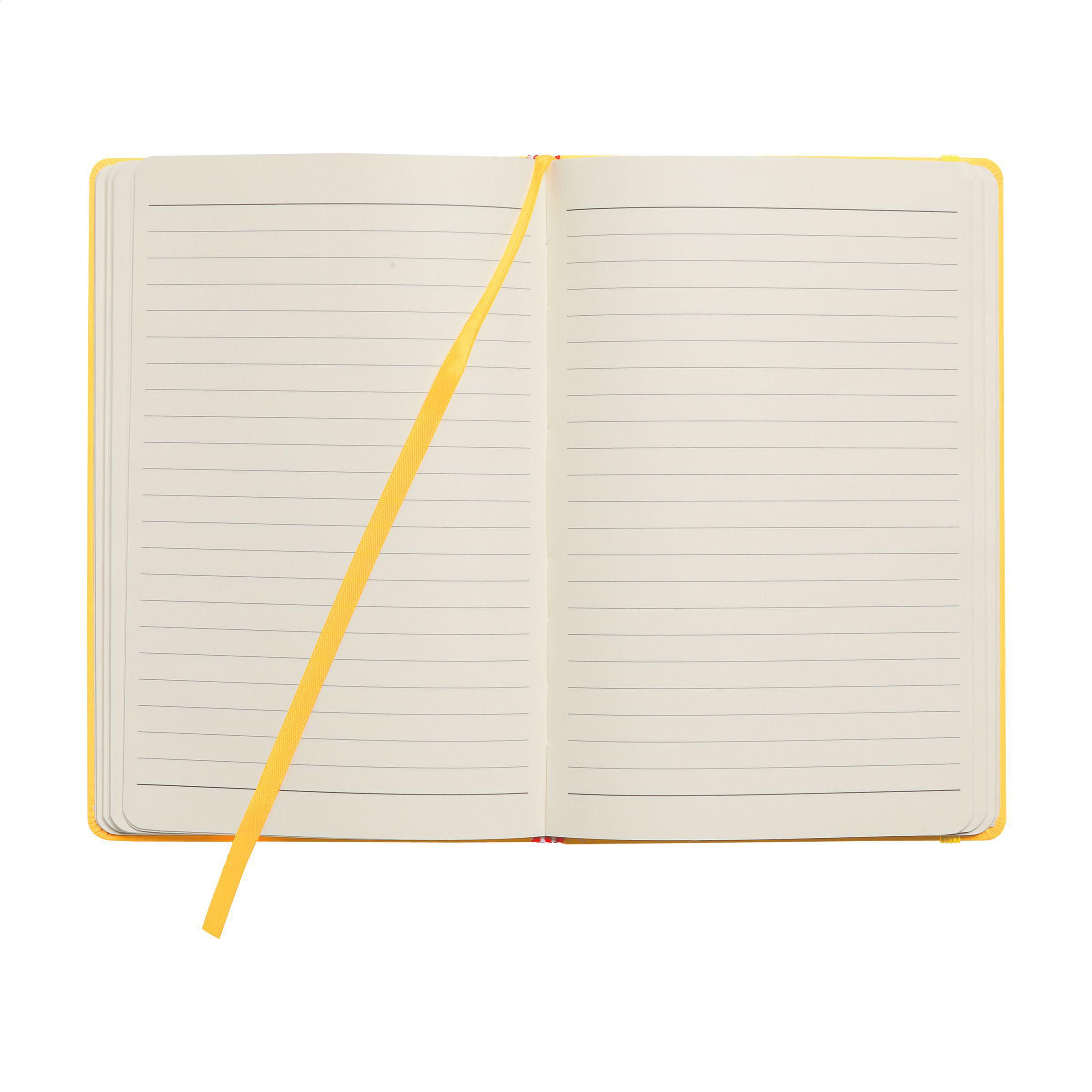 Notizbuch im A5-Format mit ca. 96 Blatt/192 Seiten crèmefarbenem, liniertem FSC Mix zertifiziertes Papier (80 g/m²). Mit gebundenem Rücken und hartem Umschlag, Verschlussgummi und seidener Leselitze.