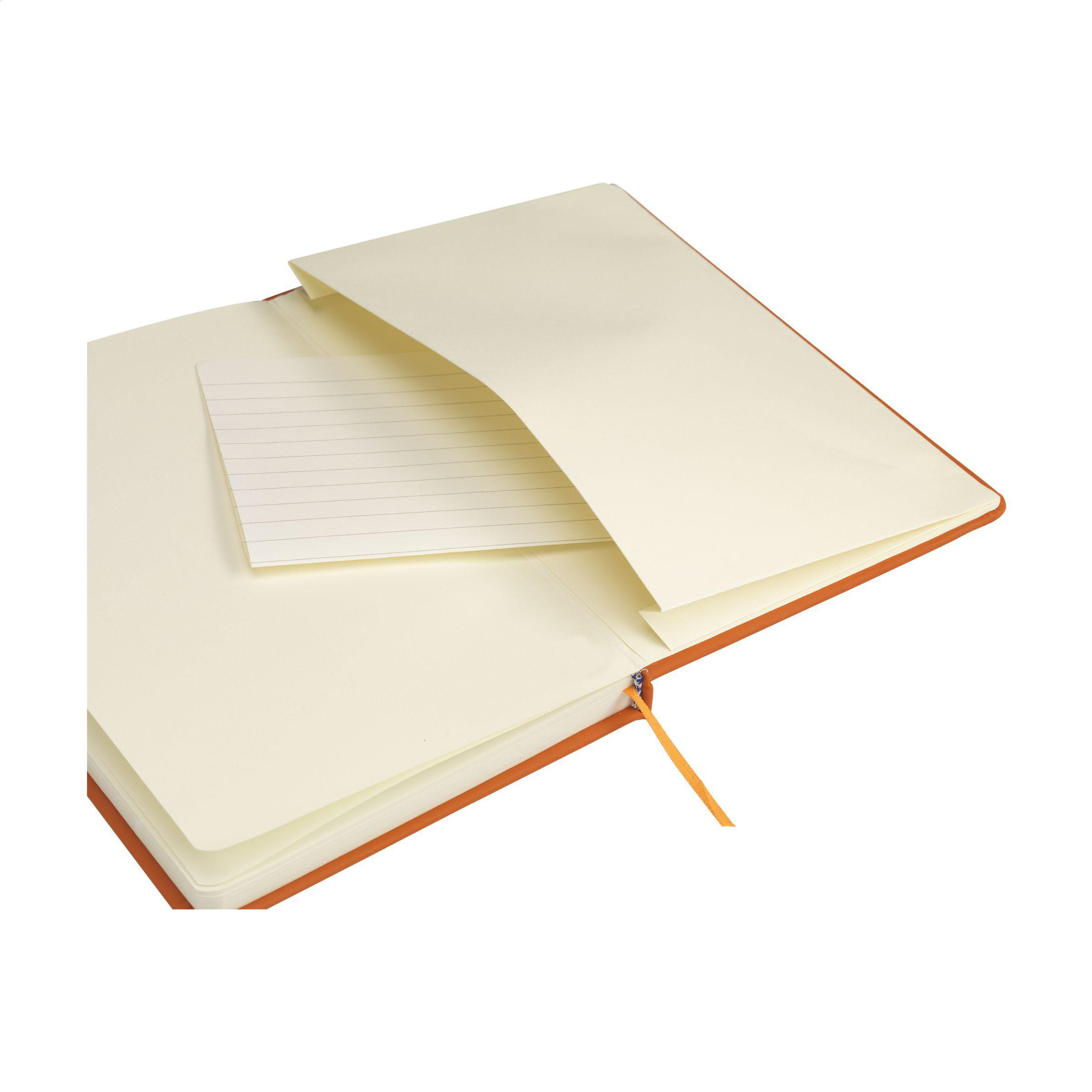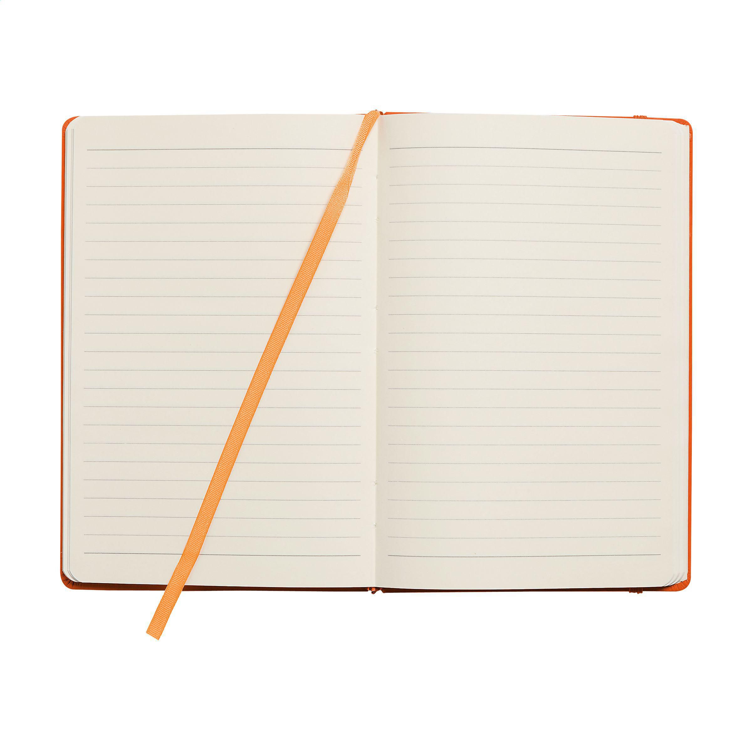 Notizbuch im A5-Format mit ca. 96 Blatt/192 Seiten crèmefarbenem, liniertem FSC Mix zertifiziertes Papier (80 g/m²). Mit gebundenem Rücken und hartem Umschlag, Verschlussgummi und seidener Leselitze.