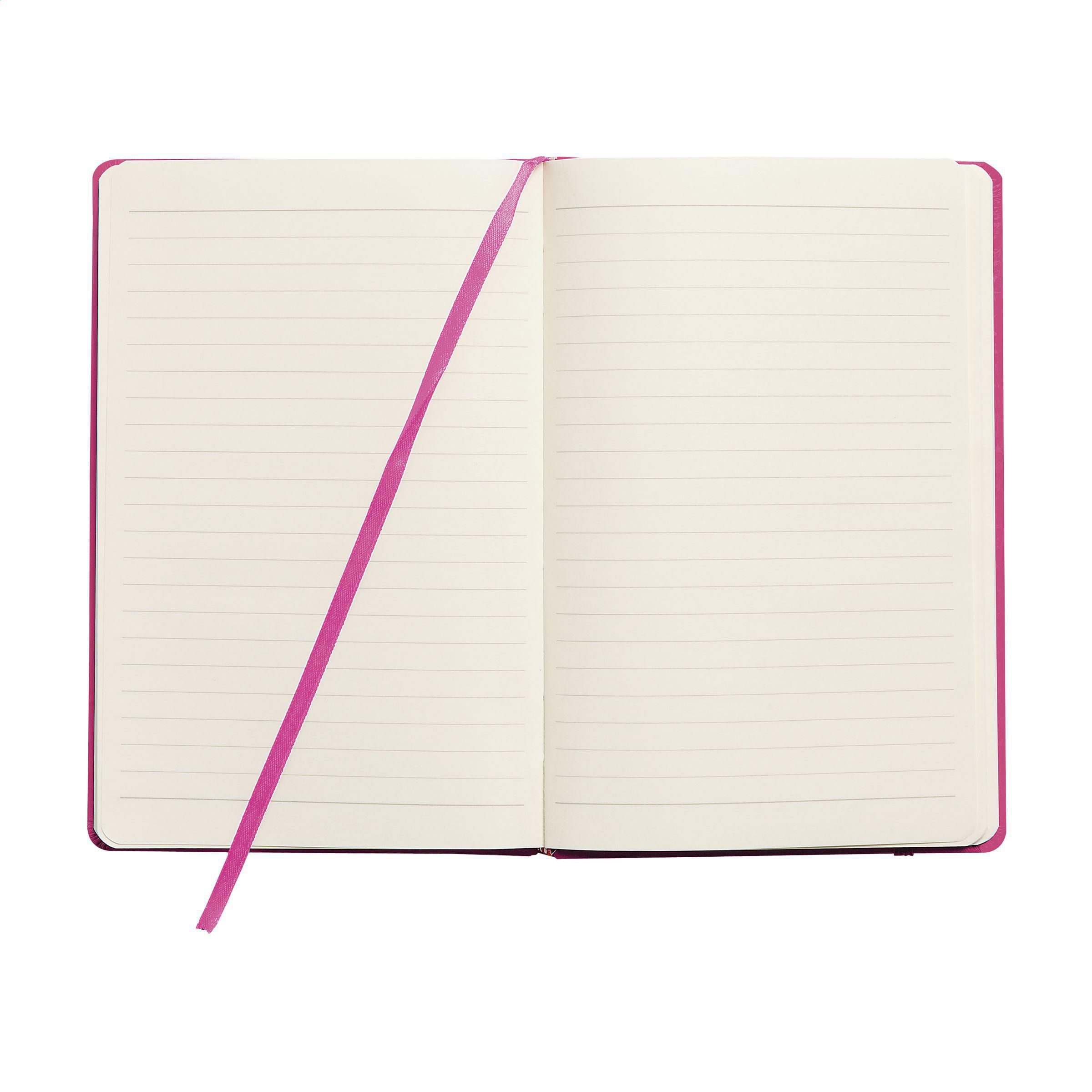 Notizbuch im A5-Format mit ca. 96 Blatt/192 Seiten crèmefarbenem, liniertem FSC Mix zertifiziertes Papier (80 g/m²). Mit gebundenem Rücken und hartem Umschlag, Verschlussgummi und seidener Leselitze.